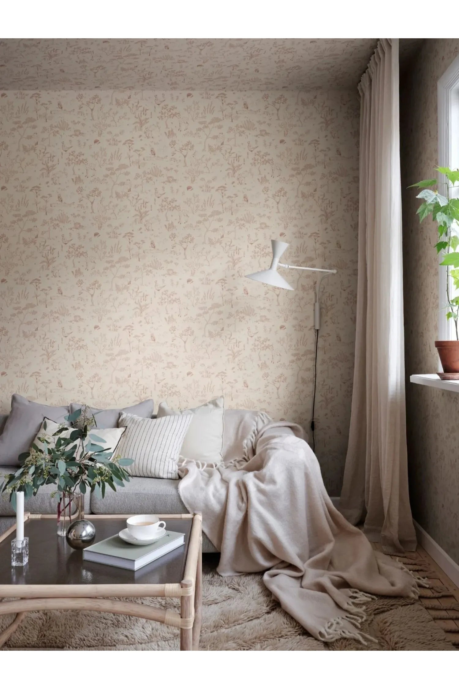 Laat de zon stralen met het lieve Hollie, Terracotta behang van Sandberg! Stap in een dromerig boslandschap met dit speelse ontwerp, perfect voor de kinderkamer. Het behang is met de hand getekend in Zweden en combineert prachtige off-white en warme terracotta tinten.