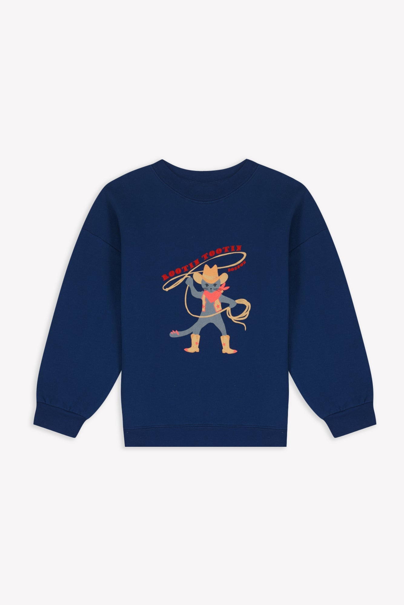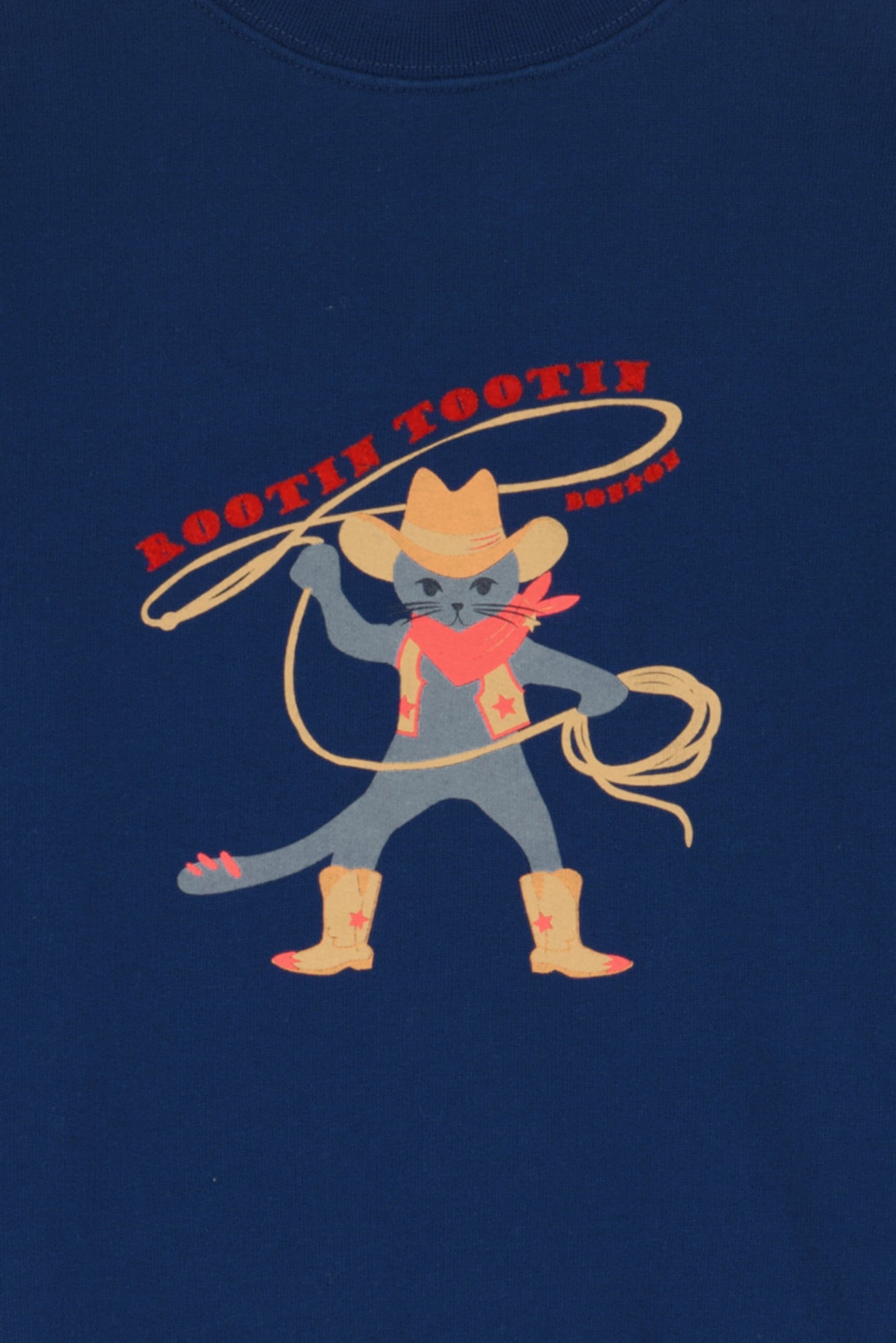 Haal de lasso's maar tevoorschijn met de stoere Lame Lasso trui van BONTON! Deze Blauw Brut sweatshirt uit de "New Barn" collectie heeft een onverschrokken cowboy kat en nodigt alle jonge avonturiers uit. Gemaakt van 100% katoen, biedt deze trui comfort en stijl voor moderne cowboys en cowgirls. Perfect om in te spelen en de wereld te ontdekken.