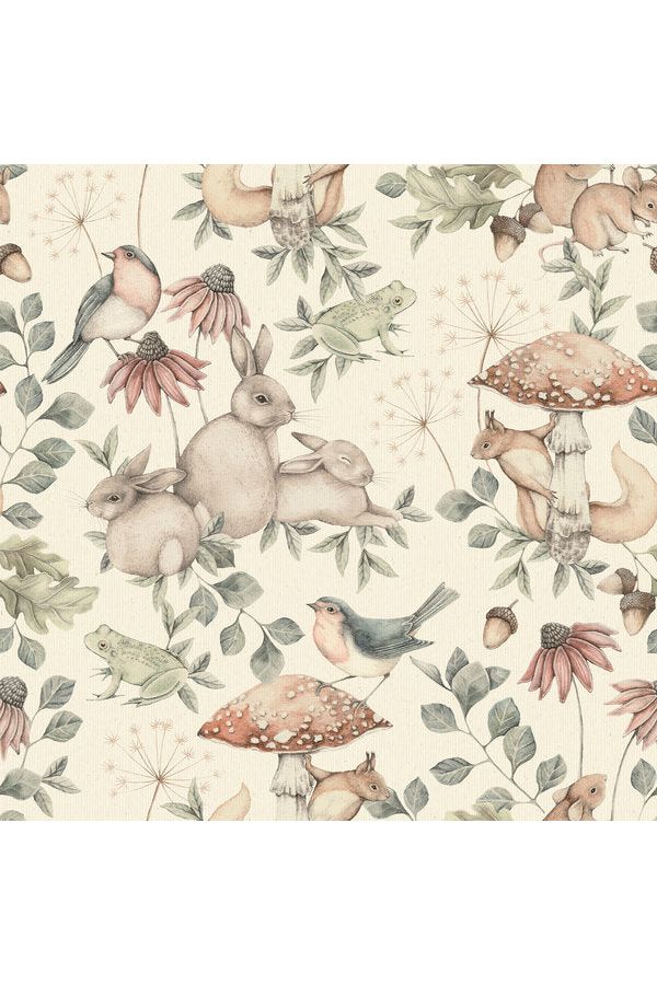 Breng de magie van het bos naar de kinderkamer met Newbie Wallpaper Minou Beige van Boråstapeter! Tussen de bosbloemen en paddenstoelen ontdek je schattige konijntjes, eekhoorntjes, kikkers en bosvogeltjes. Dit behang, in een zachte beige tint met bruine en groene details, creëert een droomwereld waar je kleintje heerlijk kan wegdromen. Perfect voor een speelse en liefdevolle sfeer!