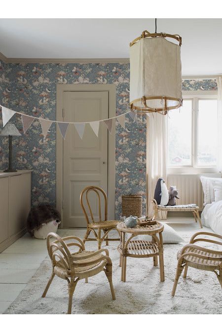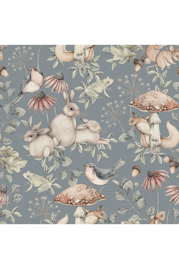 Breng een magisch bossprookje naar de kinderkamer met het Newbie Minou Blue behang van Boråstapeter! Konijntjes, eekhoorntjes, kikkers en bosvogels verstoppen zich tussen bosbloemen en paddenstoelen op dit speelse vliesbehang. De zachte blauwtinten met bruine en groene details creëren een knusse en uitnodigende sfeer. Perfect voor de kleine avonturier!
