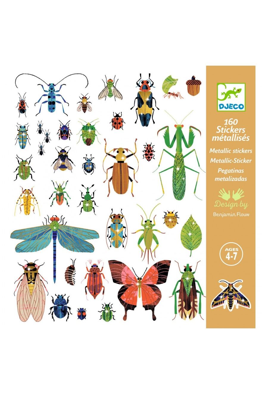 Kriebelende beestjes en glinsterende vleugels! Met de Stickerset Insecten van het Franse merk Djeco duik je in een vrolijke insectenwereld. Deze set bevat 4 stickervellen met in totaal 160 stickers, versierd met schitterende metallic details. Perfect voor kleine handjes vanaf 4 jaar om te plakken, verhalen te verzinnen en hun creativiteit de vrije loop te laten. Een superleuke, schermvrije activiteit voor uren speelplezier!