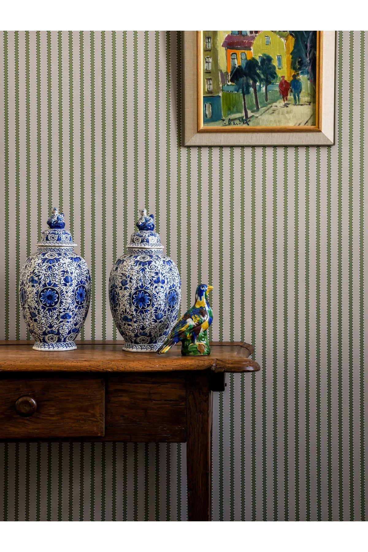 Duik in een wereld van zachte strepen met ons "Stiched Stripe" behang in Leaf Green, van het Zweedse duo Långelid / von Brömssen! Dit vrolijke behang is geïnspireerd op handgestikte stoffen, waarbij elke streep speels wordt omrand door contrasterende "steken". Het brengt een unieke, handgemaakte charme naar elke kamer. Ideaal voor een kinderkamer, of elke plek die wel wat extra vriendelijkheid kan gebruiken. Laat je muren tot leven komen met dit liefdevolle ontwerp!