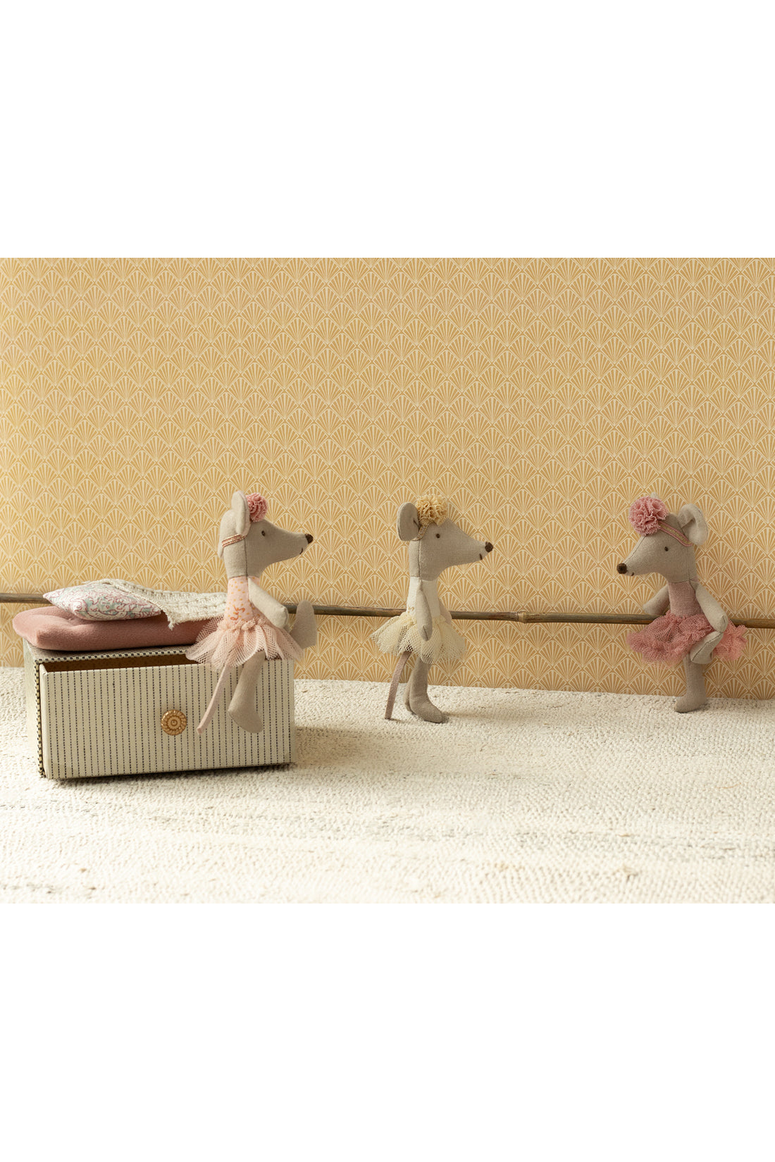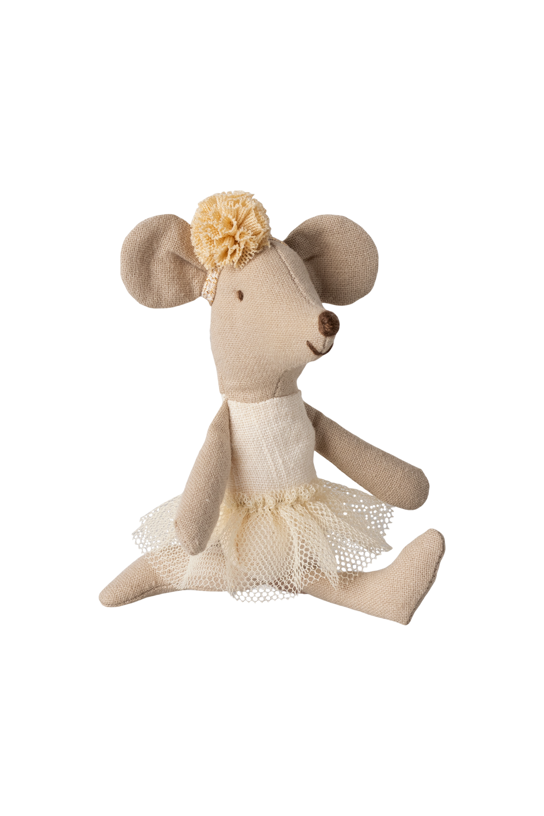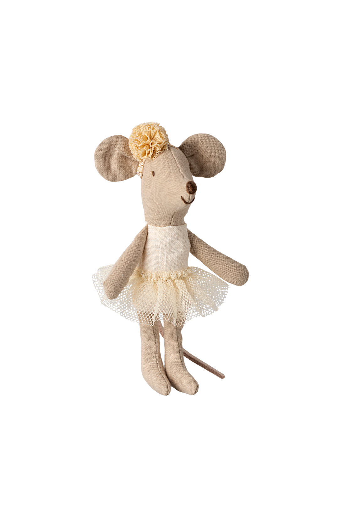 Laat je kleintje wegdromen met het schattige Ballerina Muisje, Kleine Zusje in Off-White van Maileg! Dit lieve ballerina muisje, gemaakt van zacht katoen en gerecycled polyester, is perfect voor urenlang fantasierijk speelplezier. Met haar elegante balletoutfit is ze klaar voor de meest betoverende dansvoorstellingen in de kinderkamer. Een tijdloos cadeau dat de creativiteit van je kind stimuleert.