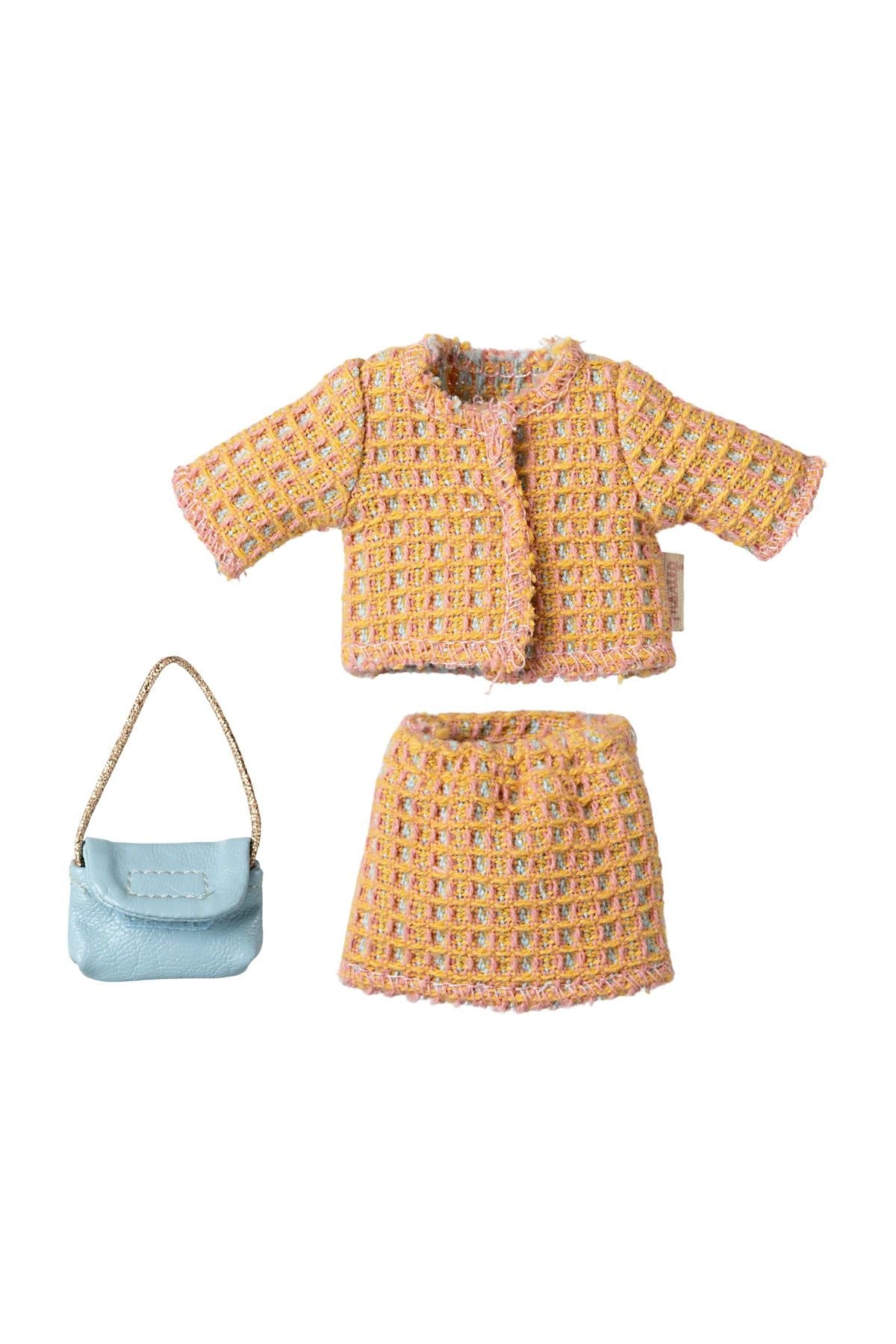 Klaar voor een stijlvol muizenuitje? Dit schattige pakje voor mama muis van Maileg is perfect voor alle fantasierijke avonturen! Het bestaat uit een kort jasje en een rok, en in het doosje vind je zelfs een écht handtasje. Gemaakt van zachte materialen zoals katoen en viscose, is dit setje ideaal om je Maileg muizenfamilie aan te kleden. Laat de speeltijd beginnen met deze charmante outfit voor mama muis, die je kindje stimuleert tot urenlang creatief spel!