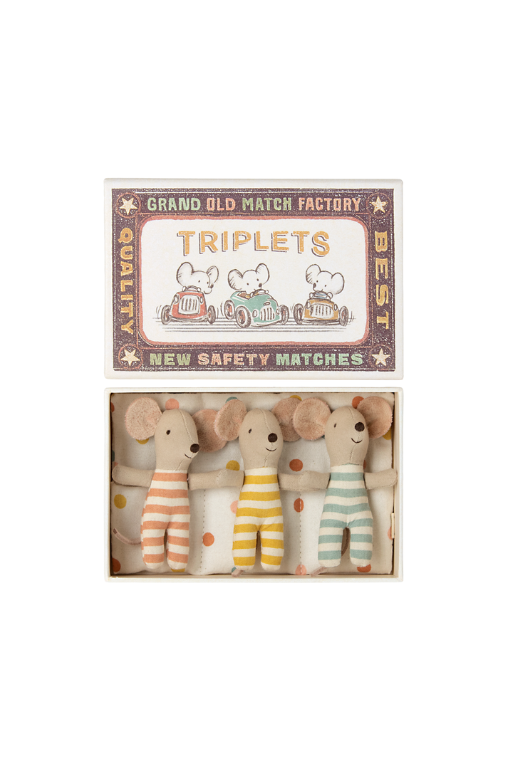 Niet één, niet twee, maar drie schattige Maileg babymuisjes wachten op hun knusse luciferdoosje! Deze drieling slaapt heerlijk in zacht beddengoed en is klaar voor urenlang fantasierijk speelplezier. Gemaakt met de bekende Maileg charme en kwaliteit, stimuleren deze muisjes de creativiteit van je kind. Een liefdevol cadeau dat generaties lang meegaat. Perfect voor kleine handjes en grote avonturen!