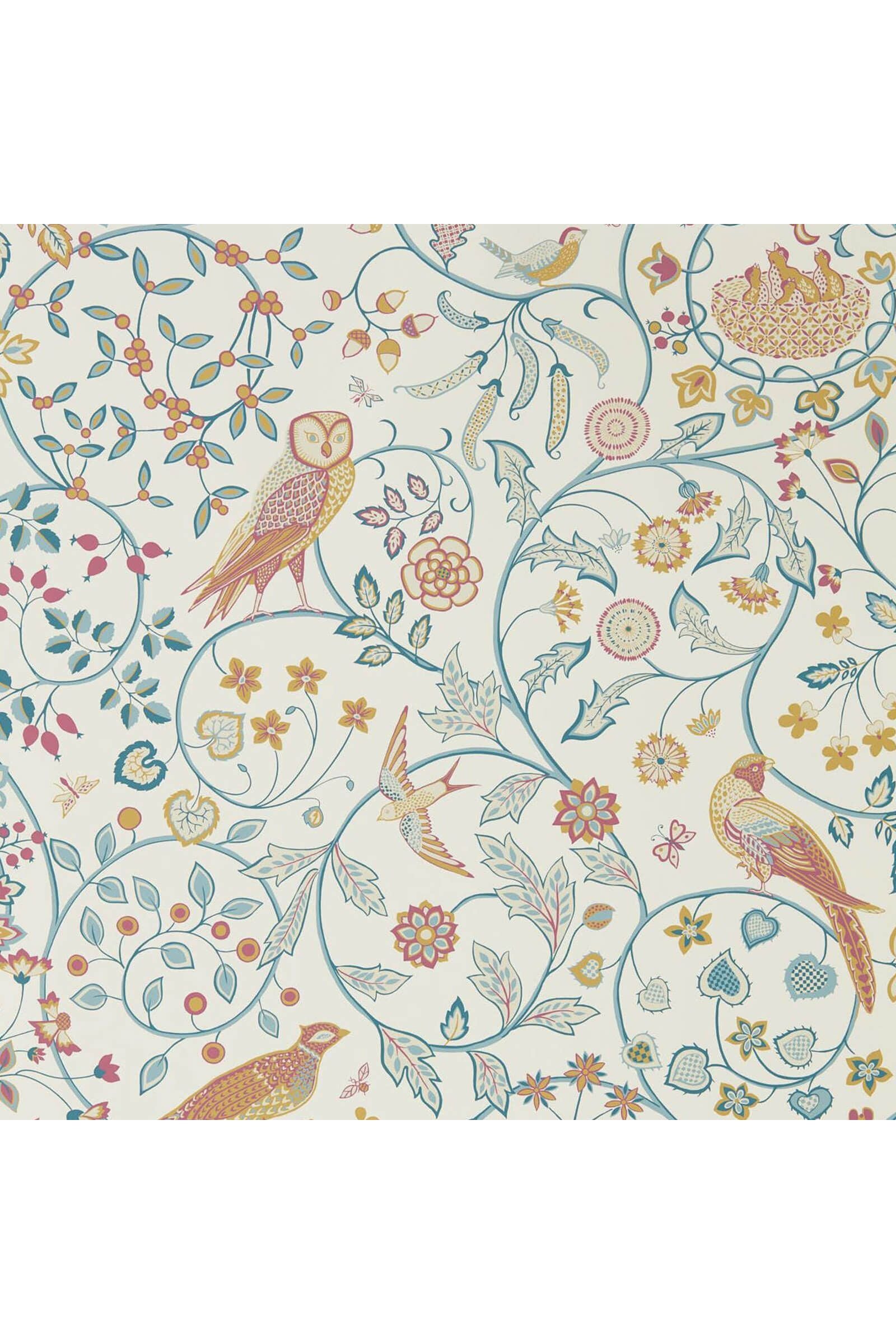 Betover je kinderkamer met het Newill Behang - Indigo Saffron van Morris & Co! Dit prachtige behang tovert de muur om in een speels tafereel van bladeren, bessen, nestelende vogels, uilen en fazanten. Geïnspireerd op een geborduurd bedsprei, brengt dit behang een vleugje natuur en fantasie in de kamer van je kleintje. Perfect voor een zachte en dromerige sfeer waar je kindje heerlijk kan wegdromen en spelen.