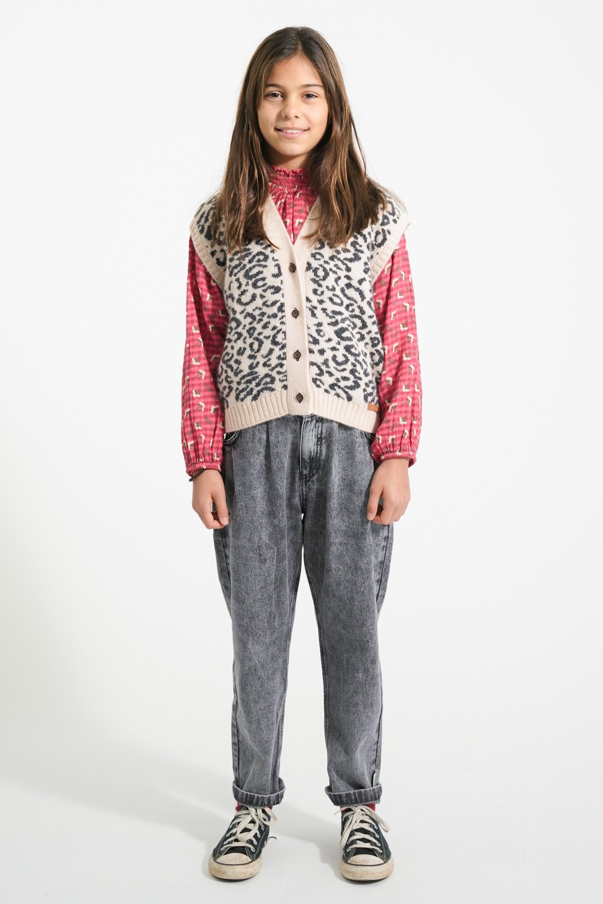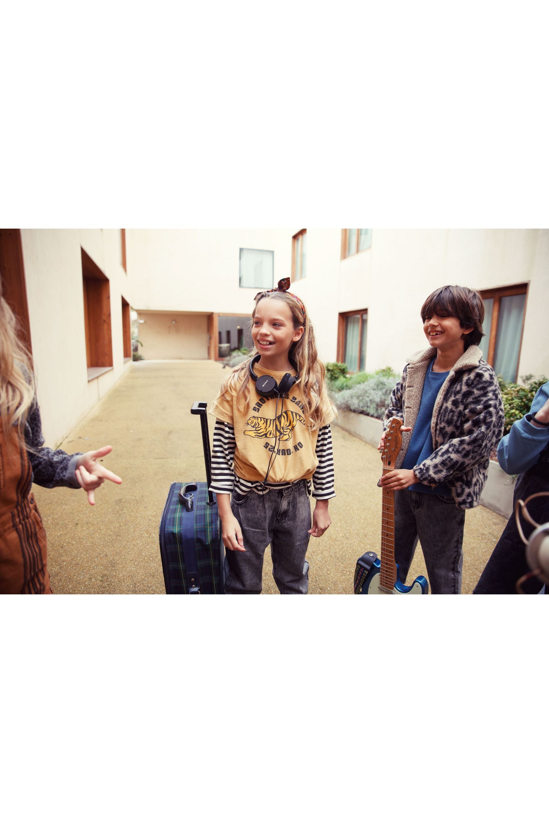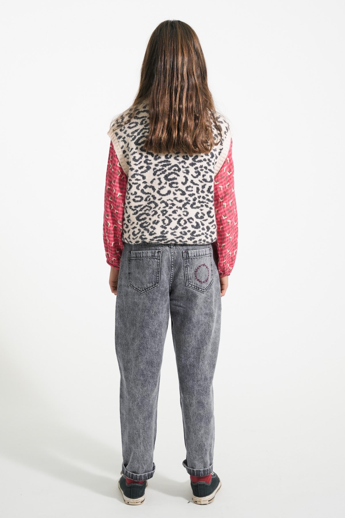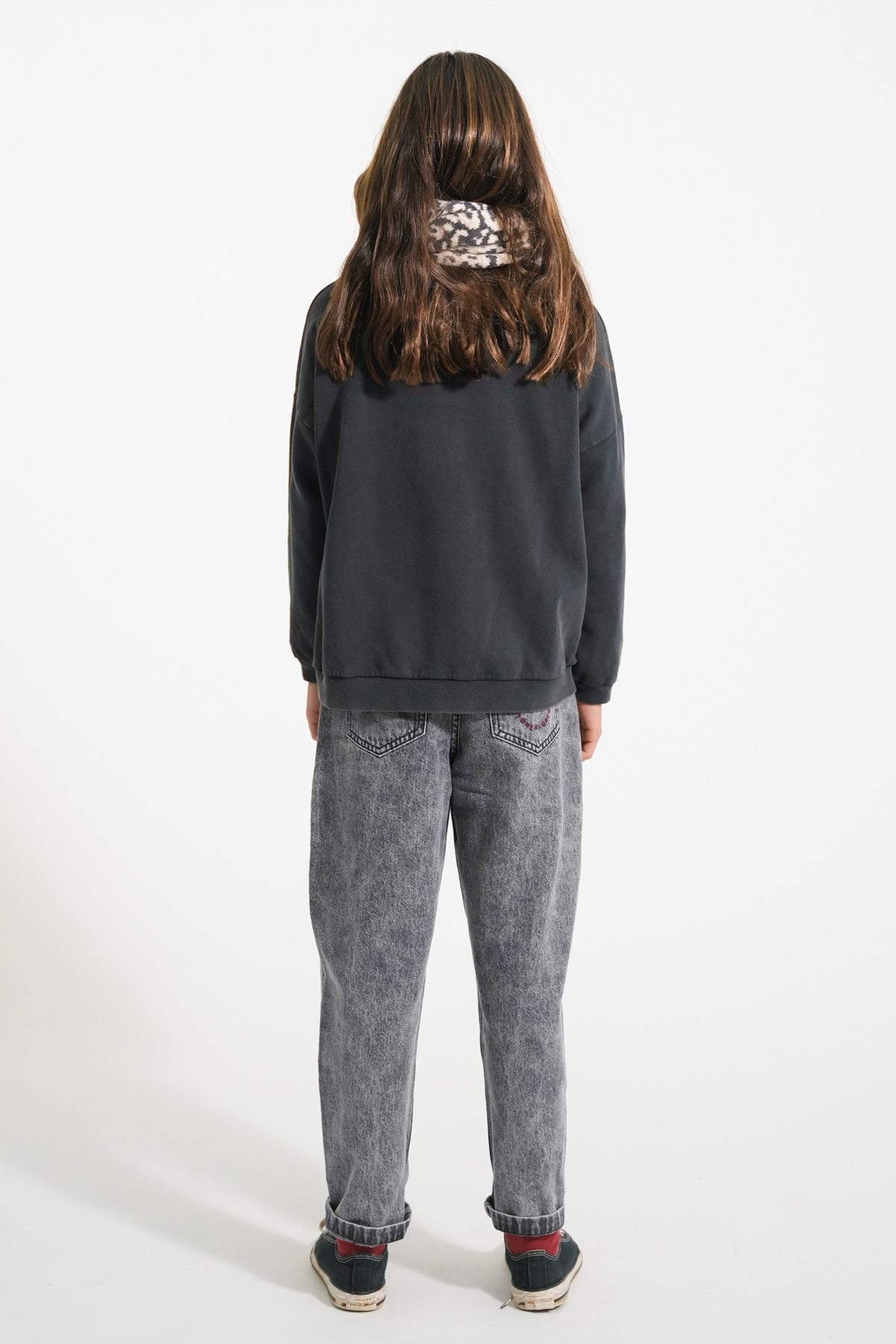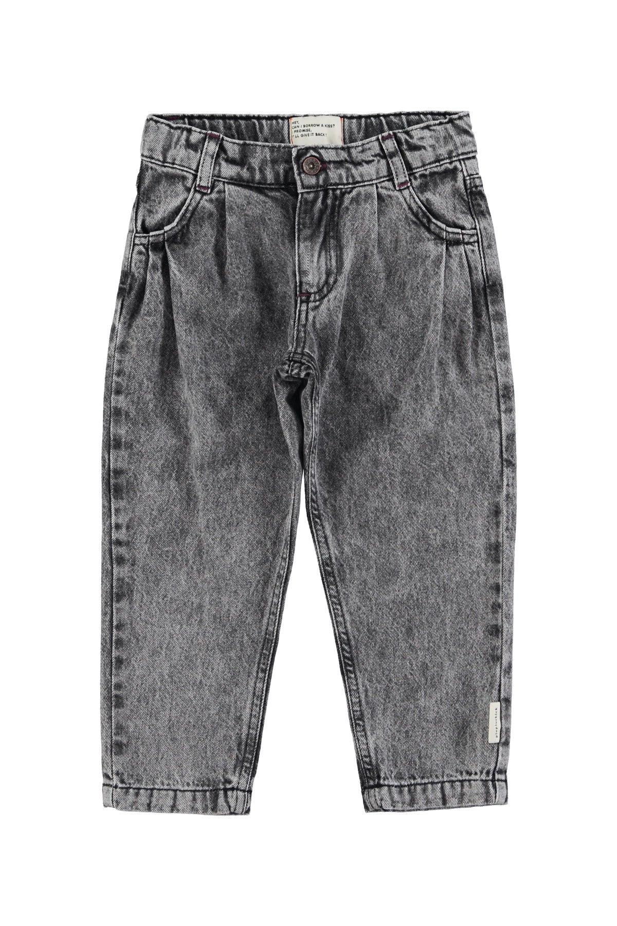 Hallo stoere kids! Klaar voor avontuur? Deze Mom fit jeans van Piupiuchick in 'washed black denim' is super comfortabel en stijlvol. Gemaakt van 100% katoen, met een verstelbare taille en coole plooien aan de voorkant. Kijk eens goed, er zit een bordeauxrood logo borduursel op de achterzak! Perfect voor spelen en rock 'n rollen. Gemaakt in Portugal.