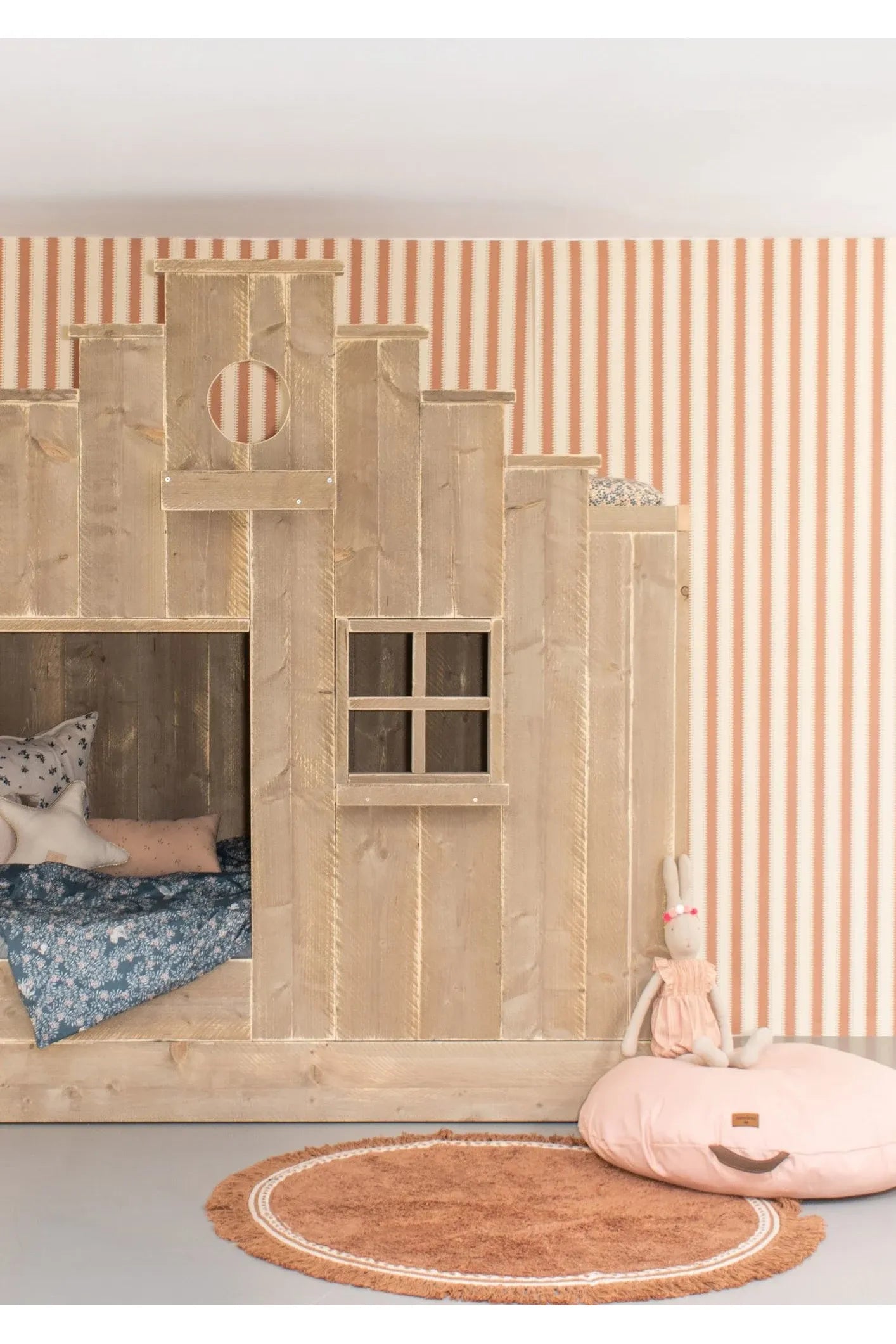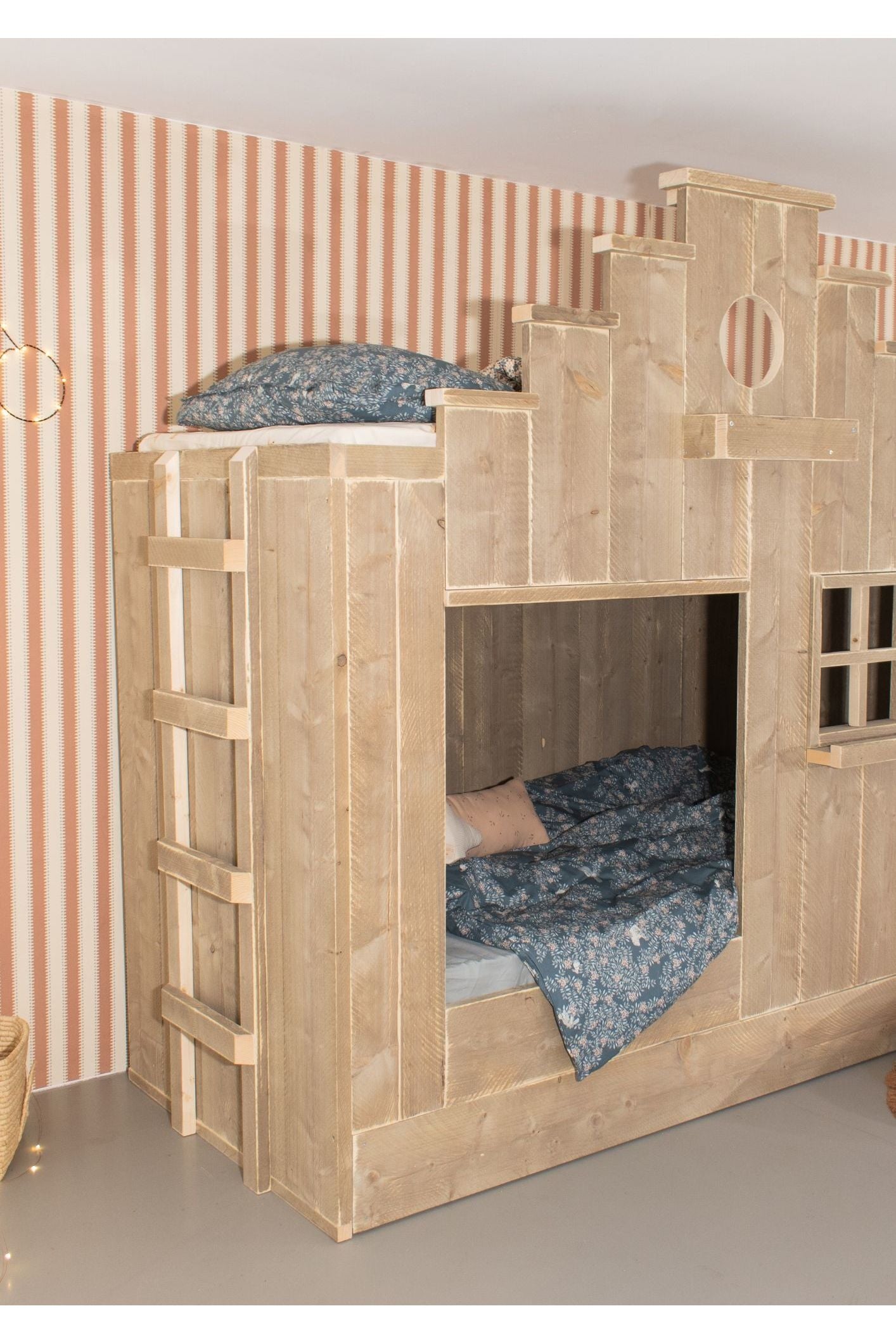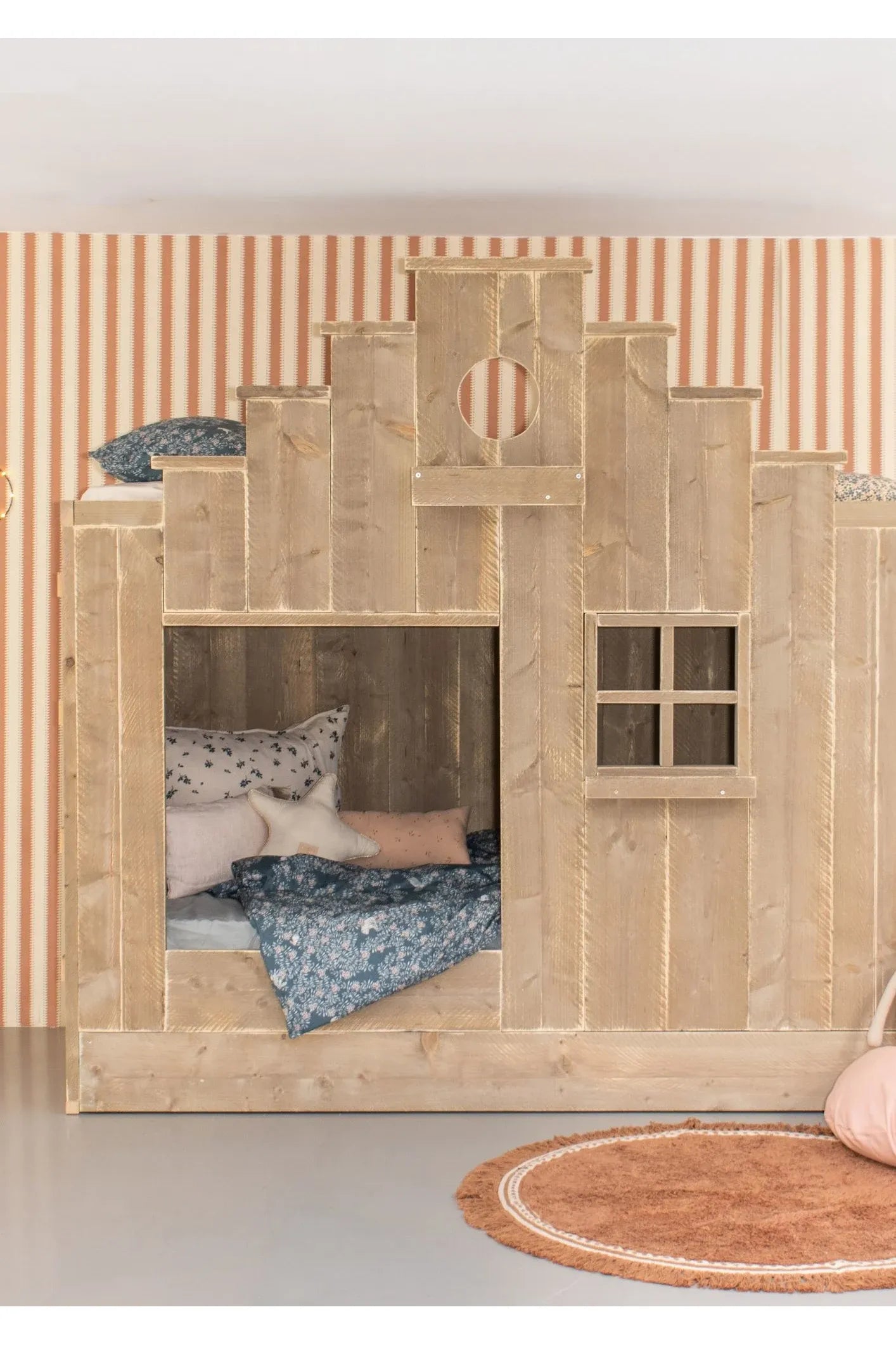 Het Stapelbed met trapgevel Bowie met bedlade van Saartje Prum is de droom van elk kind! Dit is het oorspronkelijke Vogelhuisbed, nu met een charmante vaste voorgevel en een eigentijdse naam. Het is een heerlijk knus huisjesbed met een echt trapgeveltje, perfect om lekker in weg te dromen. En het beste nieuws? Er is zelfs een handige bedlade voor extra opbergruimte of een logeermatras. De lattenbodems krijg je er gratis bij en de matrasmaat is 90x200cm. Maak van de kinderkamer een feestje met dit avontuurlijke stapelbed waar slapen en spelen perfect samenkomen!