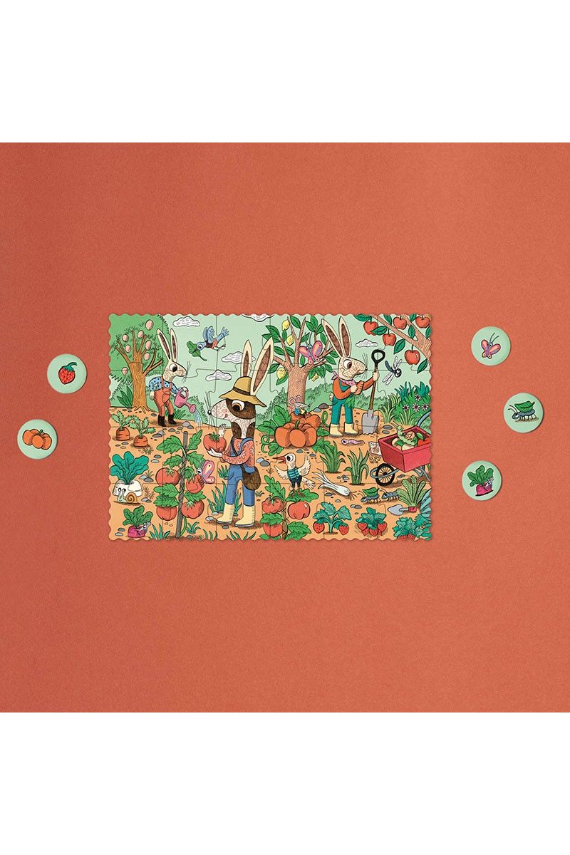 Ga op avontuur in de moestuin met de Garden Tiny Puzzle van Londji! Onze konijnenvriendjes verbouwen aardbeien, sla, watermeloenen en nog veel meer lekkere groenten en fruit. Leg de 24 stukjes bij elkaar en ontdek alle vrolijke details in de tuin. Deze kleine puzzel bevat ook 12 extra observatiestukjes om meer te leren over de tuin. Perfect voor kleine handjes vanaf 4 jaar. Gemaakt van FSC-papier en gerecycled karton.