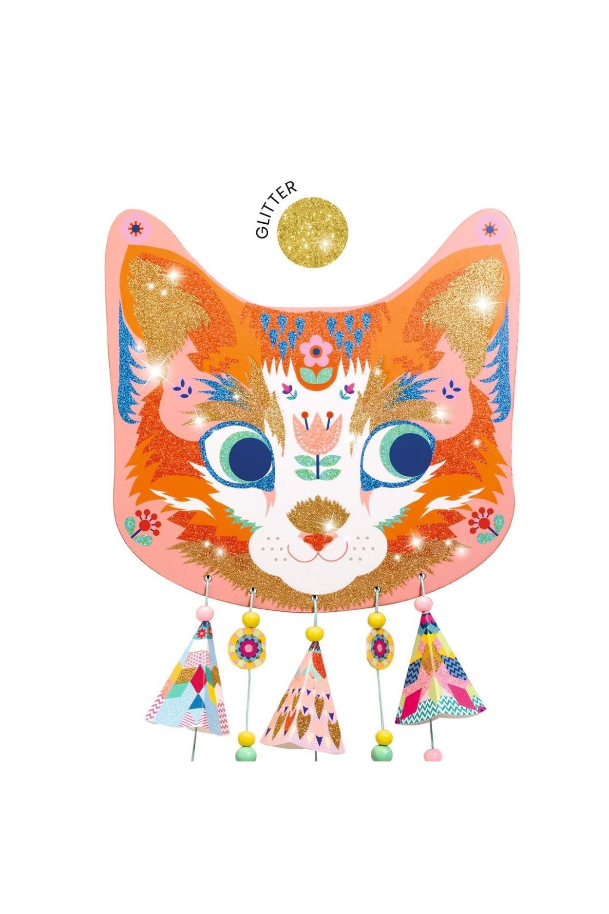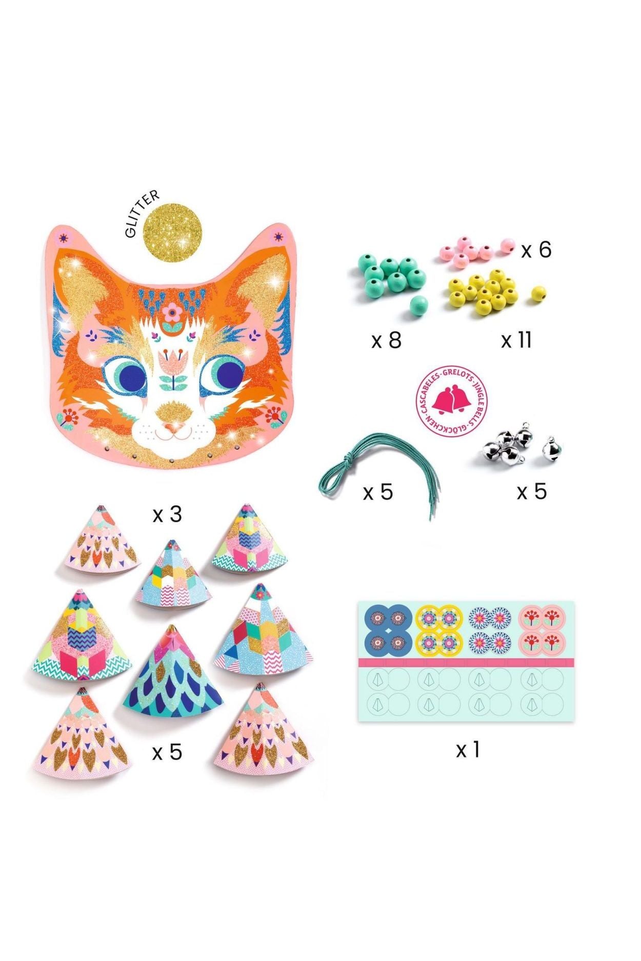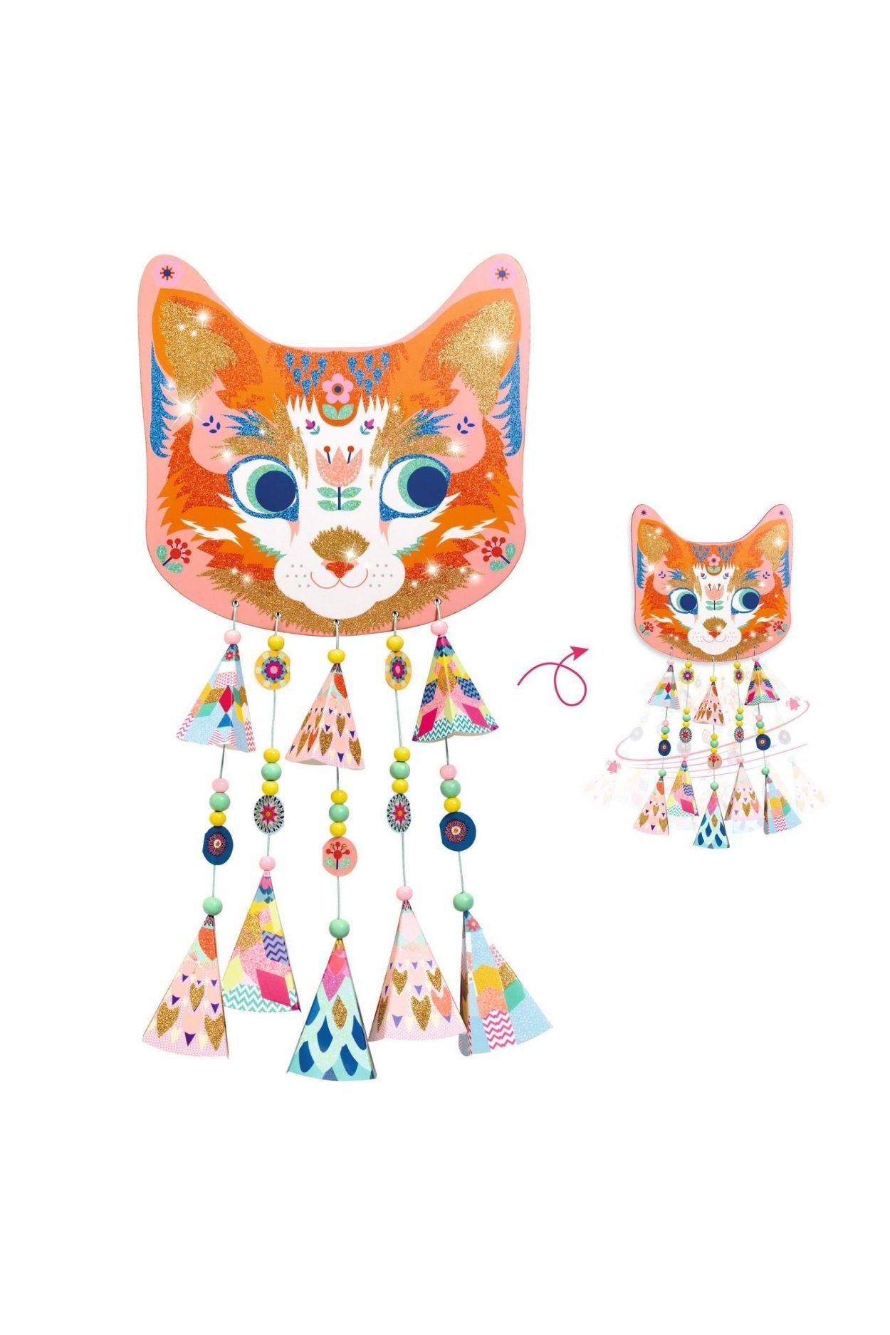Maak je eigen betoverende kattenmobiel met deze leuke DIY knutselset van Djeco! Rijg de gewaxte katoenen draden met bellen, houten kralen en geïllustreerde kegels aan de schattige poezenkop. Als de wind erdoorheen waait, rinkelt en glinstert je mobiel lieflijk. Dit is een creatief project voor kindjes vanaf 5 jaar. Uren speelplezier gegarandeerd!