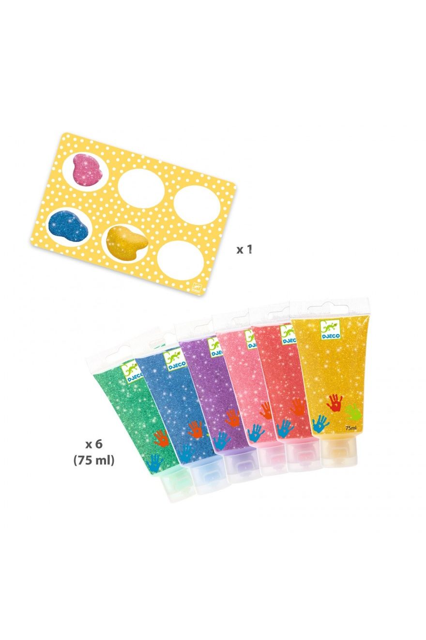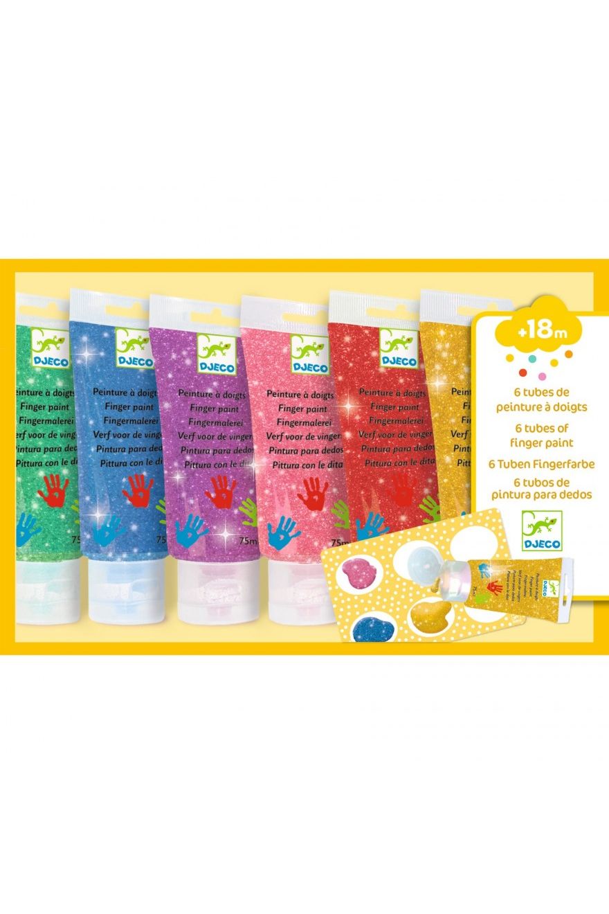 Laat de creativiteit van je kleintje sprankelen met deze prachtige Djeco vingerverf met glitters! Deze set bevat 6 grote, veilige tubes (6 x 75 ml) in vrolijke kleuren: roze, goud, blauw, groen, paars en rood. Perfect voor urenlang speelplezier, want de verf is ultra uitwasbaar en geschikt voor kindjes vanaf 18 maanden. Er zit zelfs een handig plastic palet bij. Kliederen mag!
