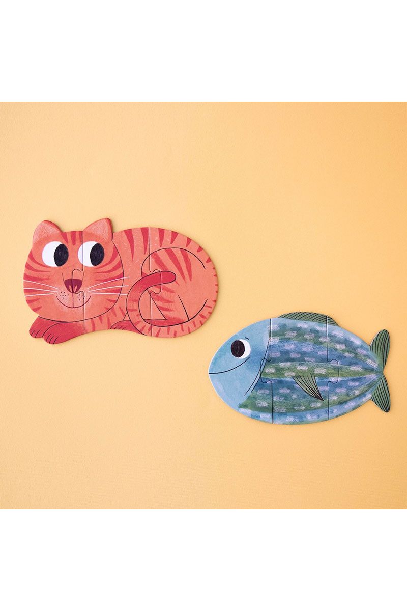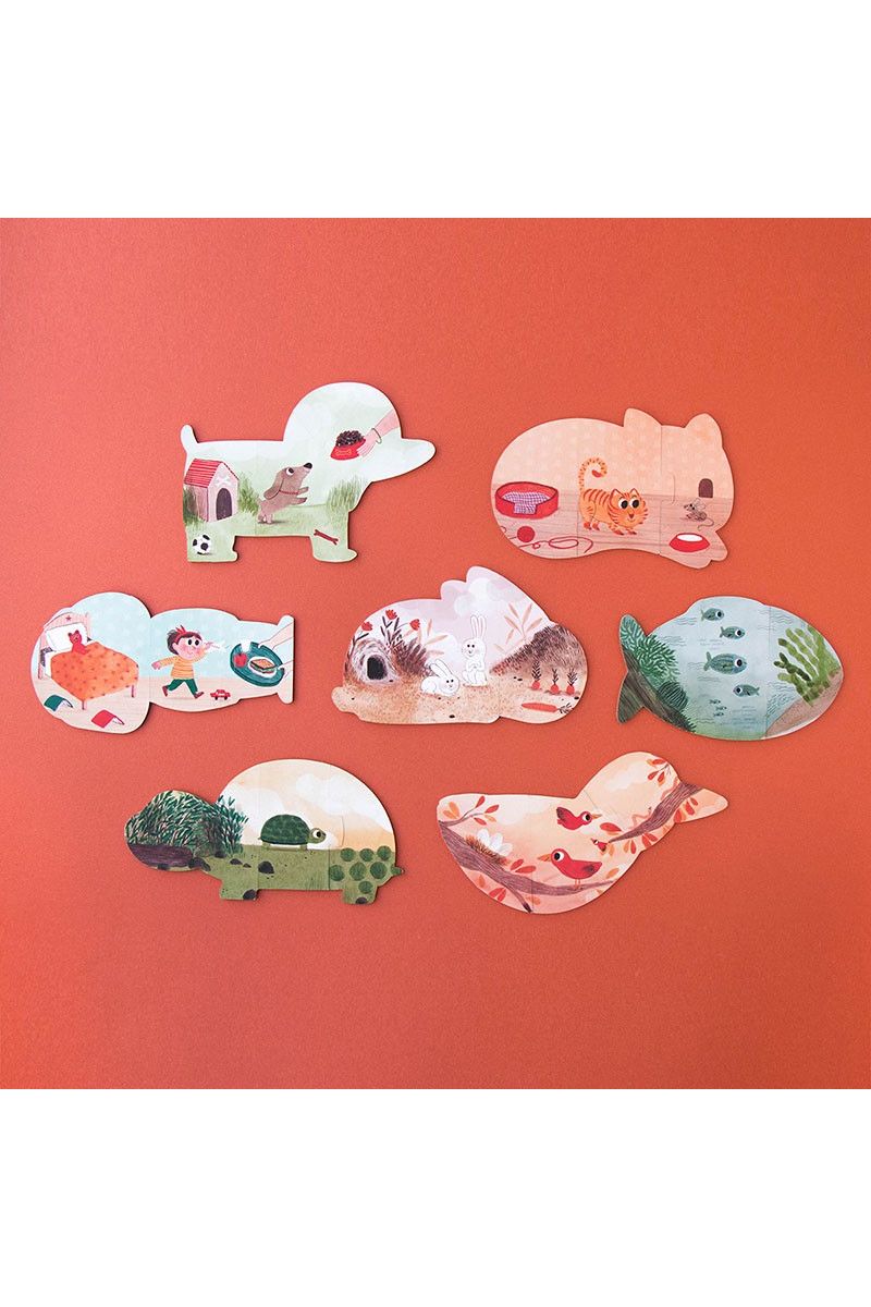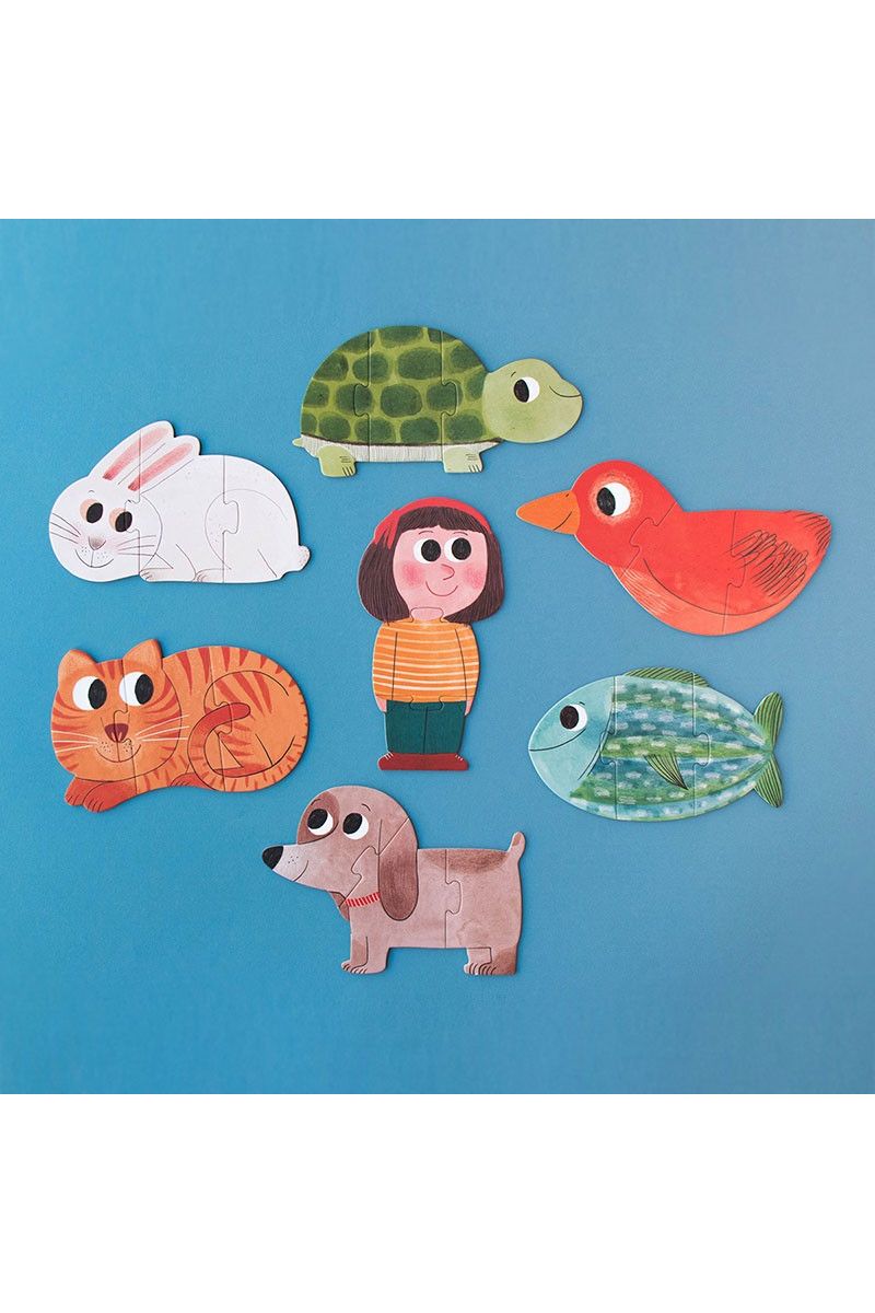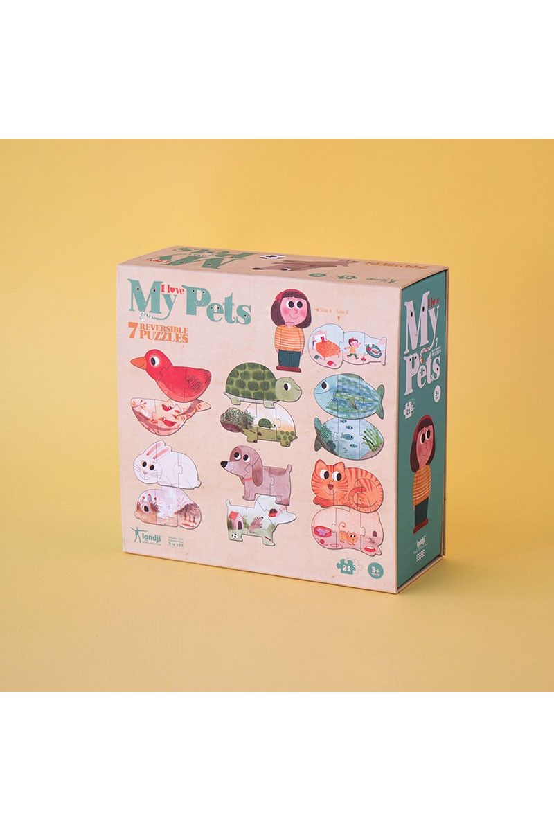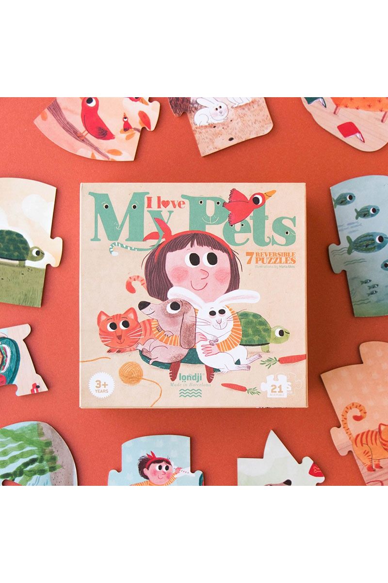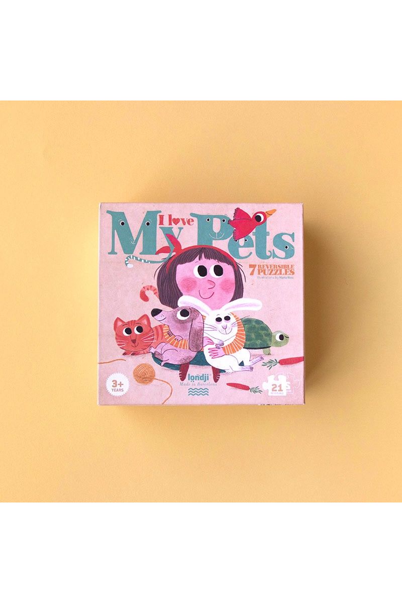 Speel jij ook zo graag met je huisdieren? Met deze "I love my pets" puzzel van Londji krijg je er maar liefst zeven! Er zijn zes schattige dierenpuzzels (kat, hond, konijn, vis, vogel en schildpad) en één van een meisje. Leuk detail: de puzzels zijn dubbelzijdig! Zo ontdekken kleintjes vanaf 3 jaar spelenderwijs waar hun favoriete dier woont. De 3-delige stukken zijn extra groot, perfect voor kleine handjes om makkelijk te puzzelen.