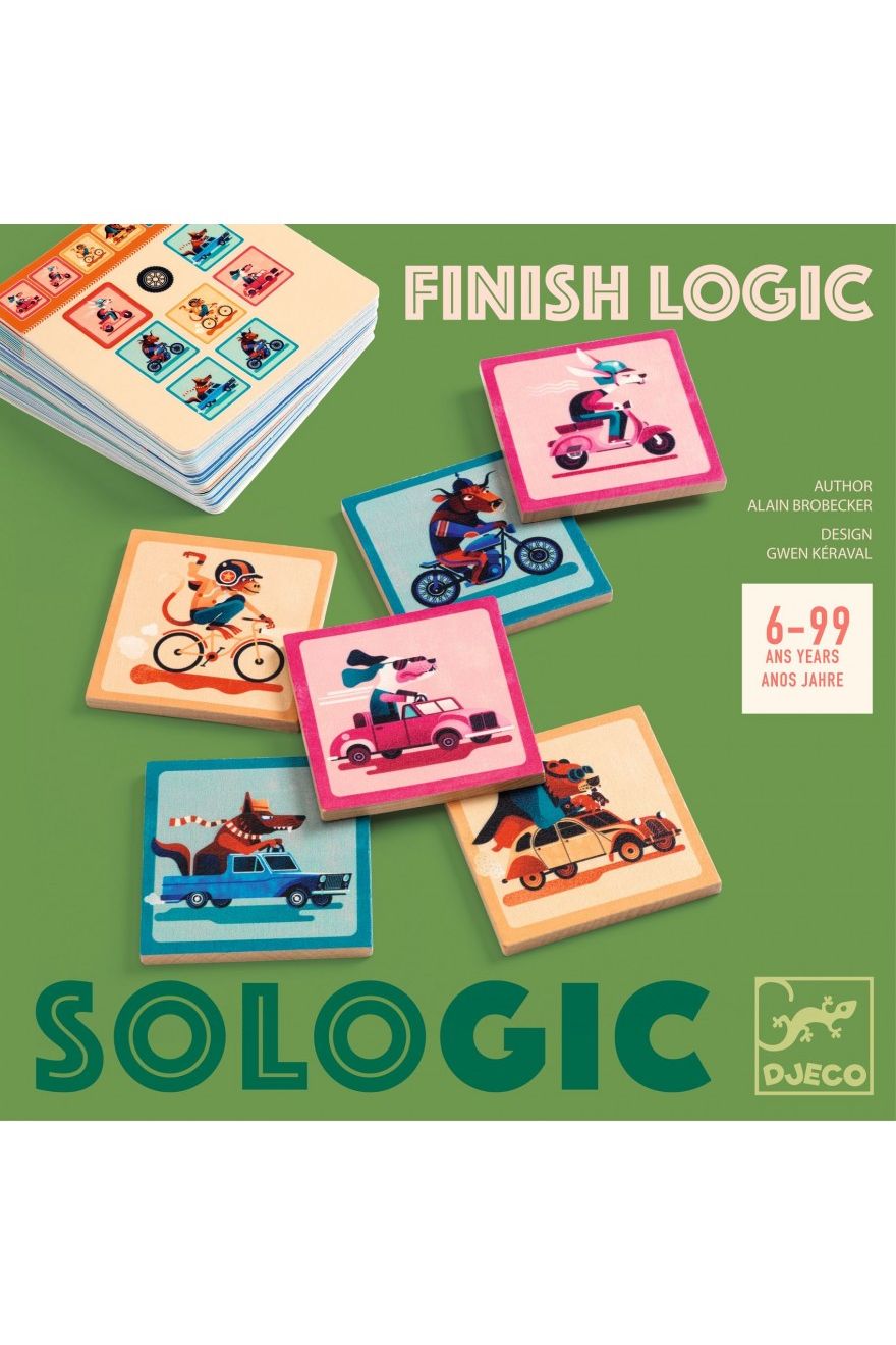 Stap in de spannende race van Sologic Finish Logic van Djeco! Dit superleuke logica- en deductiespel is perfect voor slimme kids vanaf 6 jaar. Een buffel op een motor, een aap op een fiets... de dieren racen er vrolijk op los! Los de 40 uitdagingen op om te ontdekken in welke volgorde ze de finish bereiken. Een ideaal solospel dat geduld en logisch denken stimuleert. Plezier gegarandeerd!