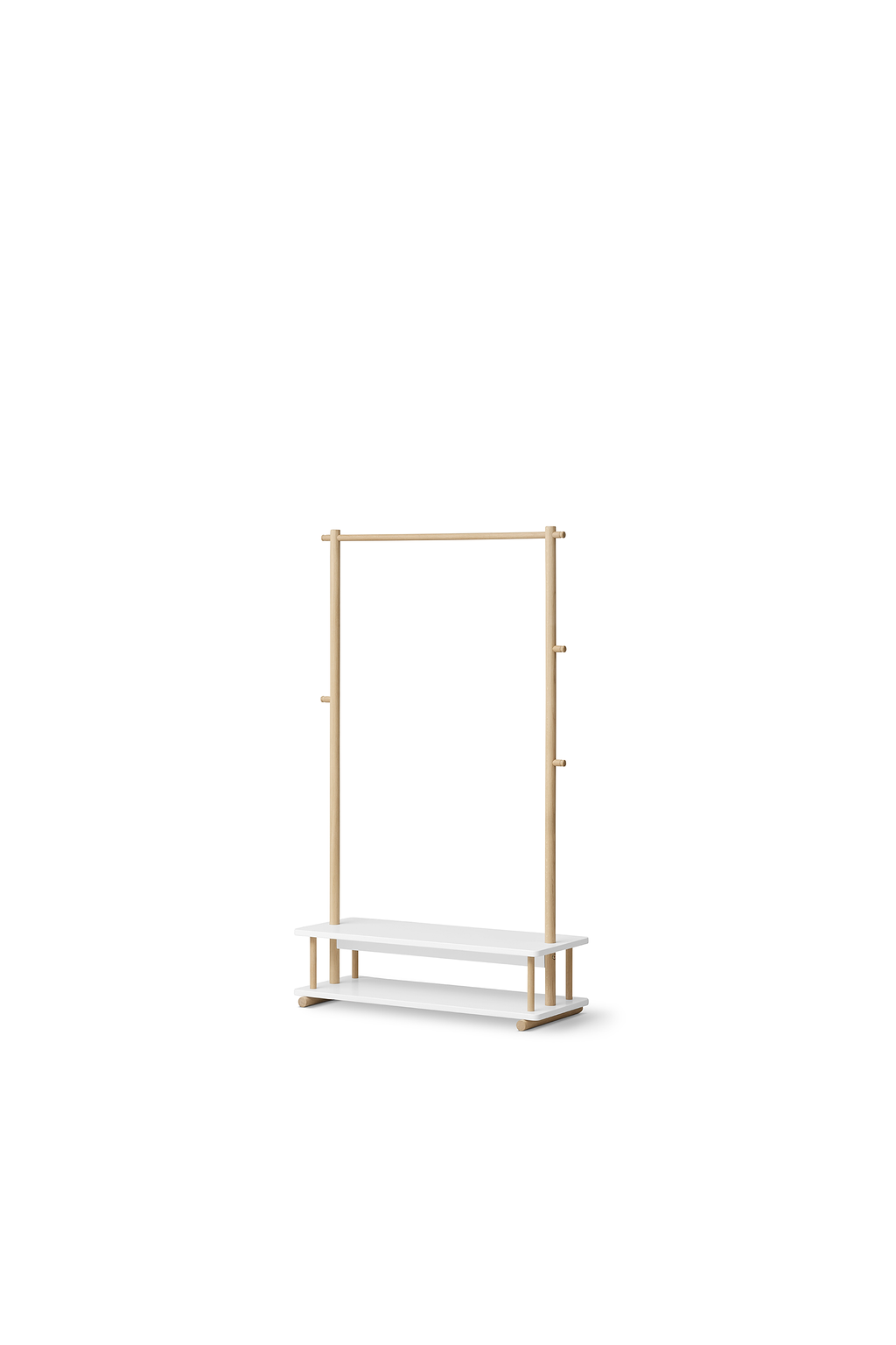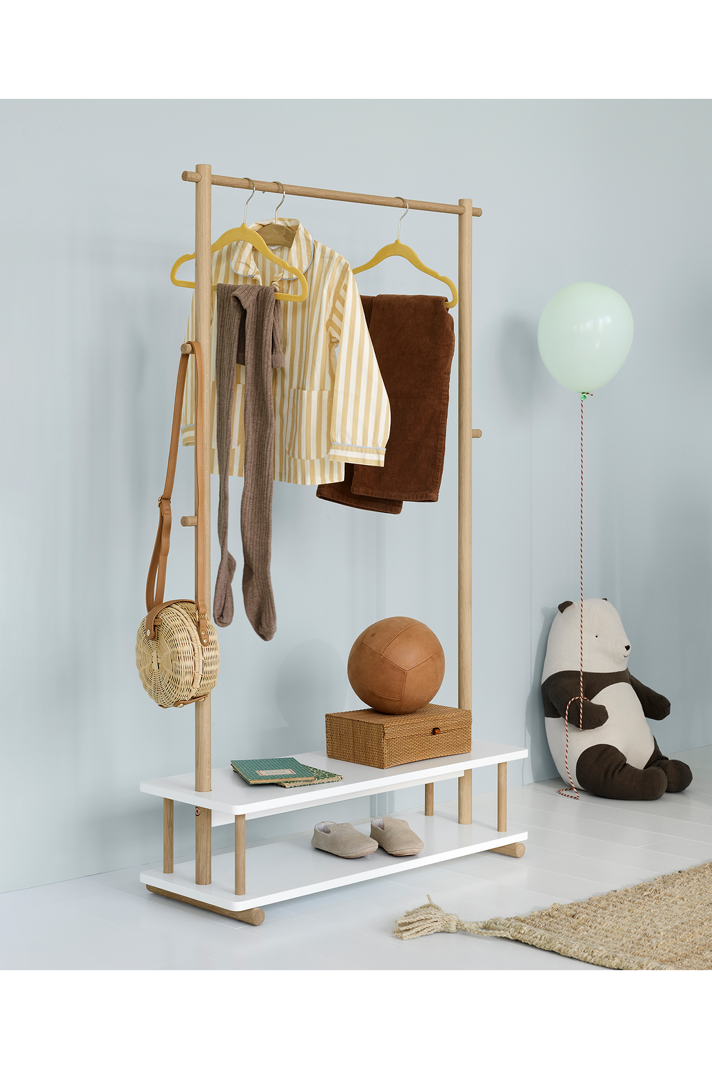 Tijd om op avontuur te gaan met de Camp kledingrek van Oliver Furniture! Dit vrolijke kledingrek, in wit en eiken, doet denken aan een hemelbed frame. Perfect om alle avontuurlijke outfits, van regenjassen tot onzichtbaarheidscapes, netjes op te hangen. De twee planken onderin bieden ruimte voor balletpakjes en wandelschoenen. Met de kleine ronde haakjes aan de zijkant is alles makkelijk te pakken. Gemaakt van duurzaam, wit geolied massief eiken en MDF. Afmetingen: 76 x 130 x 30 cm.