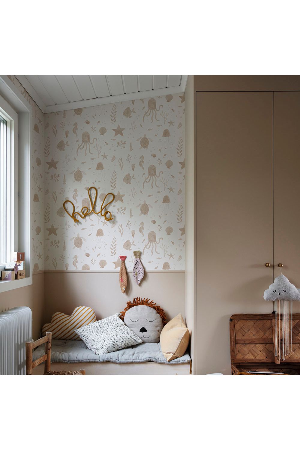 Duik in een vrolijke onderwaterwereld met het Della, Coral behang van Sandberg! Schattige octopusjes, vrolijke kwallen, schildpadden en vissen zwemmen langs de muur. Dit behang, vernoemd naar de 7-jarige Della die hielp met het ontwerp, tovert elke kinderkamer om tot een zoete oceaan vol avontuur. Het Zweedse merk Sandberg brengt met deze koraalkleurige print een speelse en liefdevolle sfeer in huis, perfect voor kleine ontdekkingsreizigers.