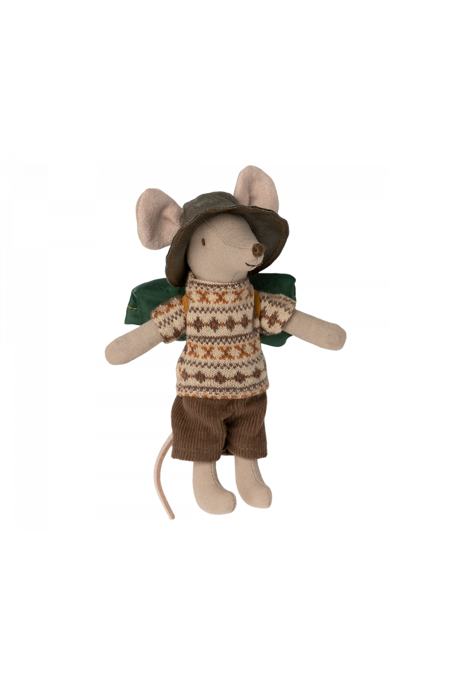 Ontdek de avontuurlijke Hiker Muis, Grote Broer van Maileg! Deze stoere muis is helemaal klaar voor een trektocht in de natuur. Hij draagt zijn comfortabele outfitt en heeft een slaapzak bij zich voor gezellige nachten onder de sterren. Met magneetjes in zijn handjes kan hij gemakkelijk dingen vasthouden. Combineer hem met andere items uit de hiker collectie voor nog meer fantasierijk speelplezier! Perfect voor kleine ontdekkingsreizigers.