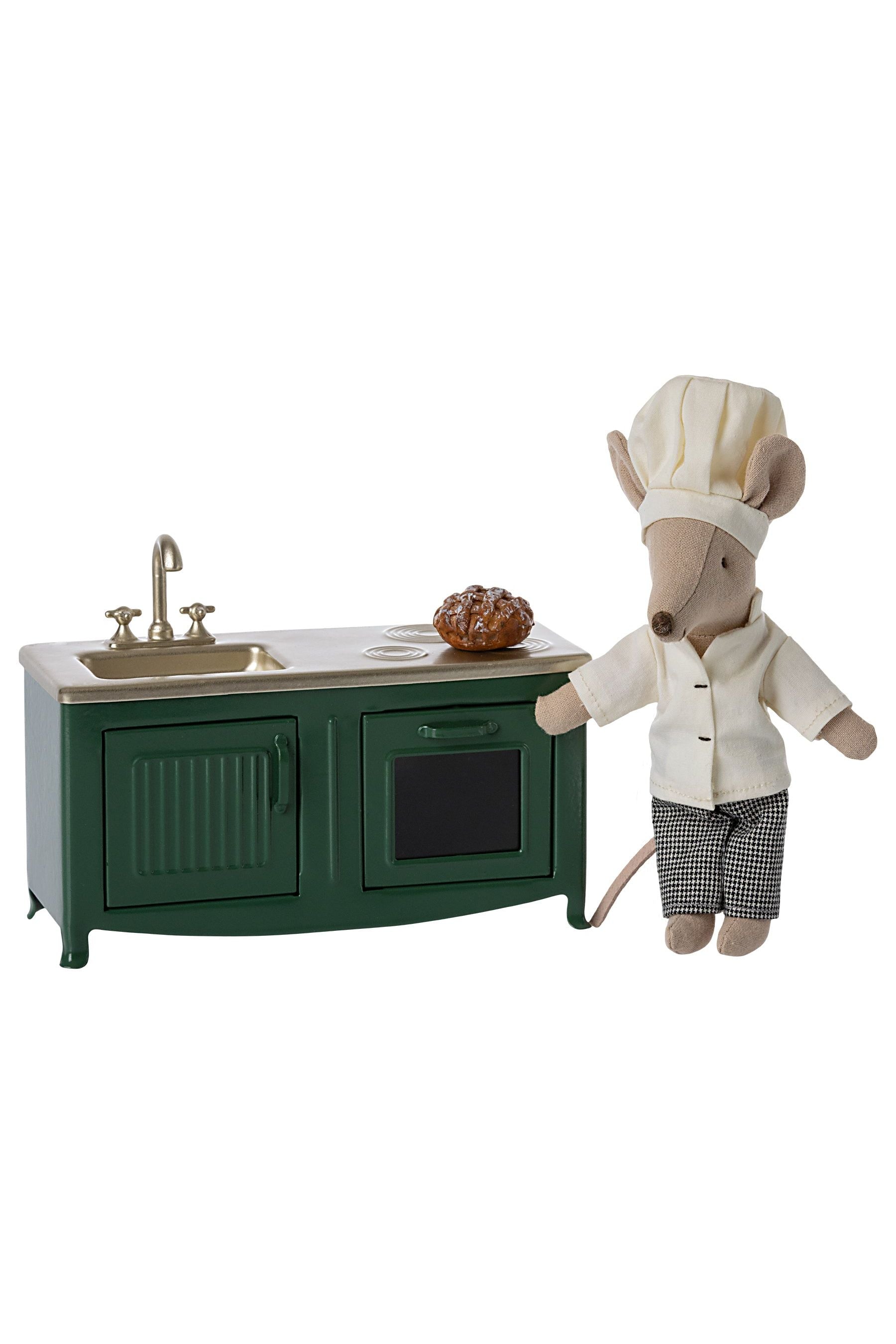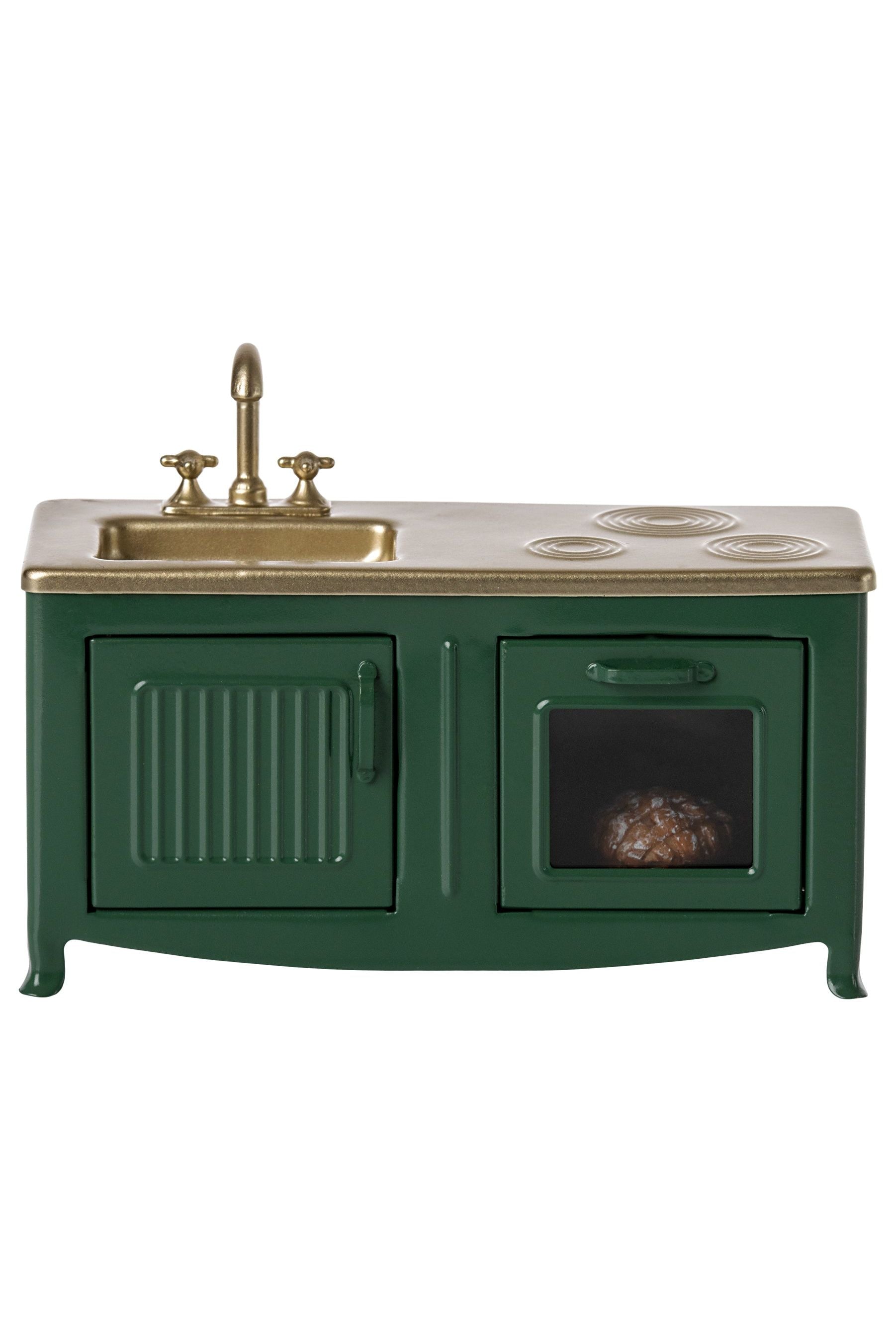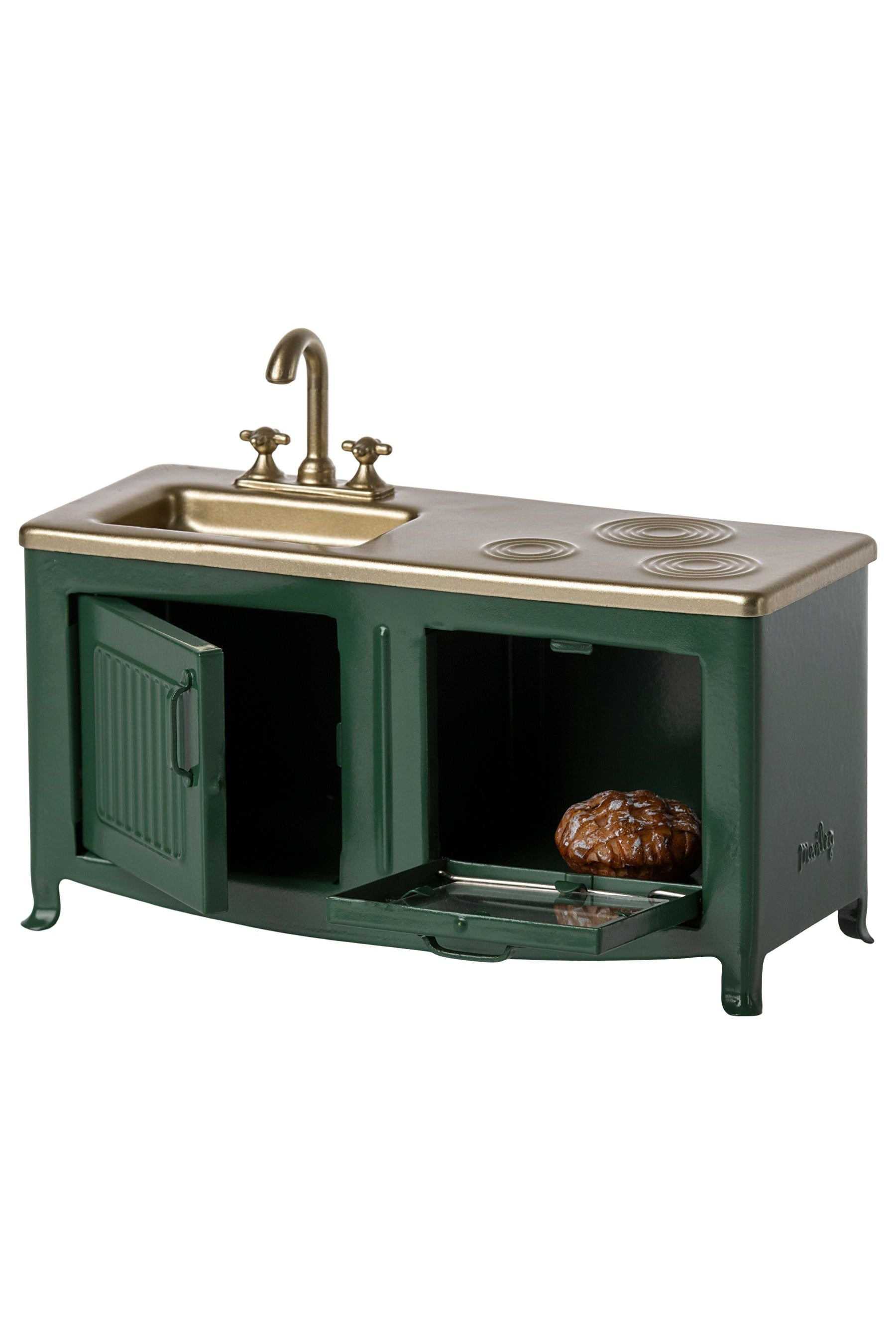 Het hart van elk muizenhuis is de keuken! Deze prachtige Maileg metalen keuken in donkergroen heeft schattige details, zoals een kastdeurtje, spoelbak en zelfs een oven met een versgebakken taart. Perfect voor de Maileg muizenfamilie om urenlang fantasierijk te koken en te smullen. Een heerlijke toevoeging voor de kinderkamer die garant staat voor speelplezier!