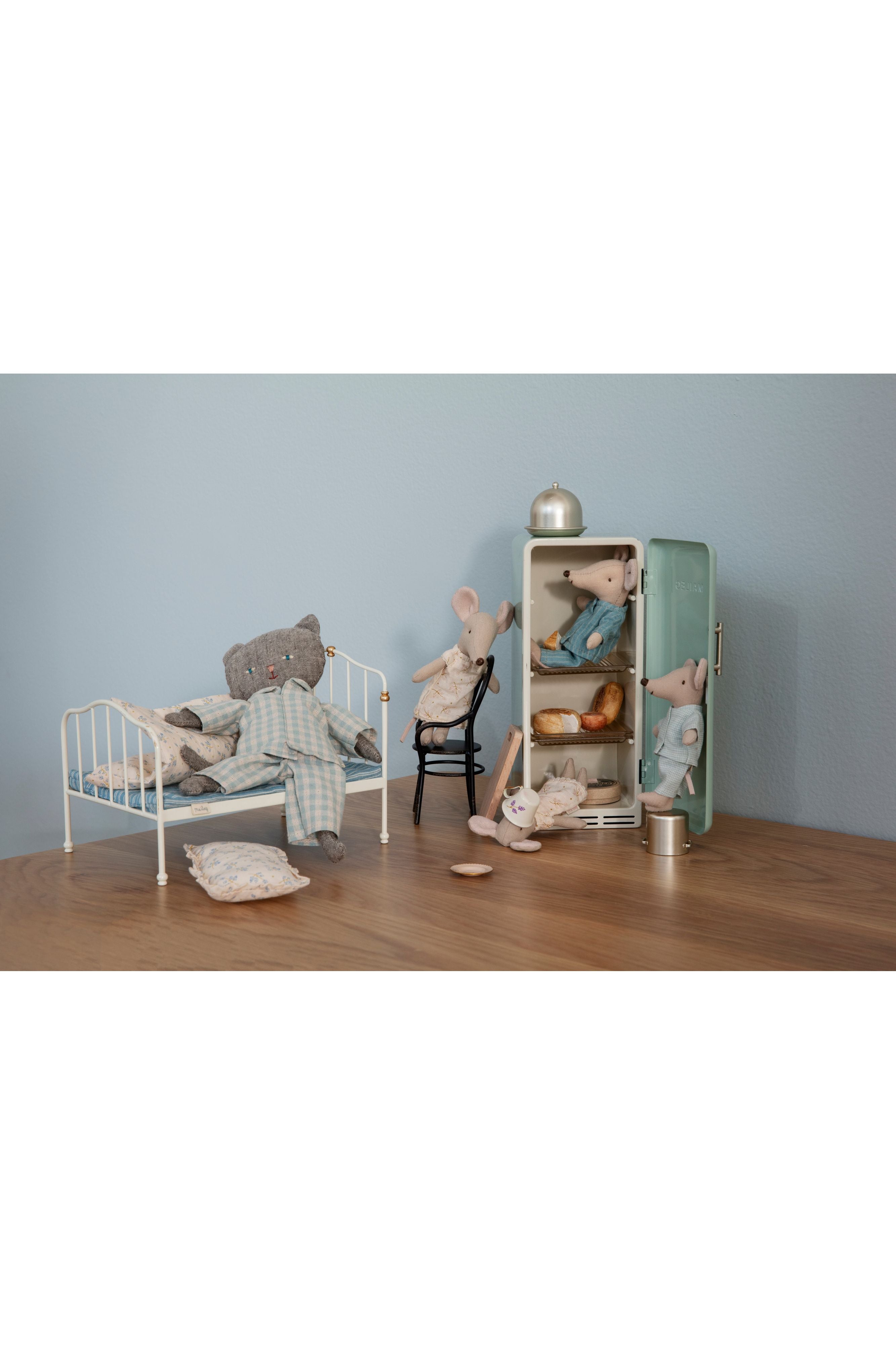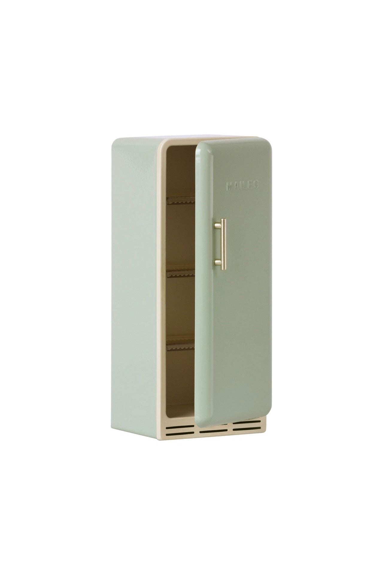 Laat de fantasie van je kleintje sprankelen met de Maileg Miniature Koelkast in fris mint! Deze schattige, ouderwetse koelkast van het geliefde merk Maileg past perfect in elk poppenhuis. Gemaakt van metaal met een magneetsluiting en matte planken, is het een duurzame toevoeging aan de speelkamer. Vul de koelkast met onze Miniature boodschappenbox voor eindeloos speelplezier! Perfect voor urenlange, fantasierijke avonturen en het creëren van een knus thuis voor de Maileg vriendjes van je kind.
