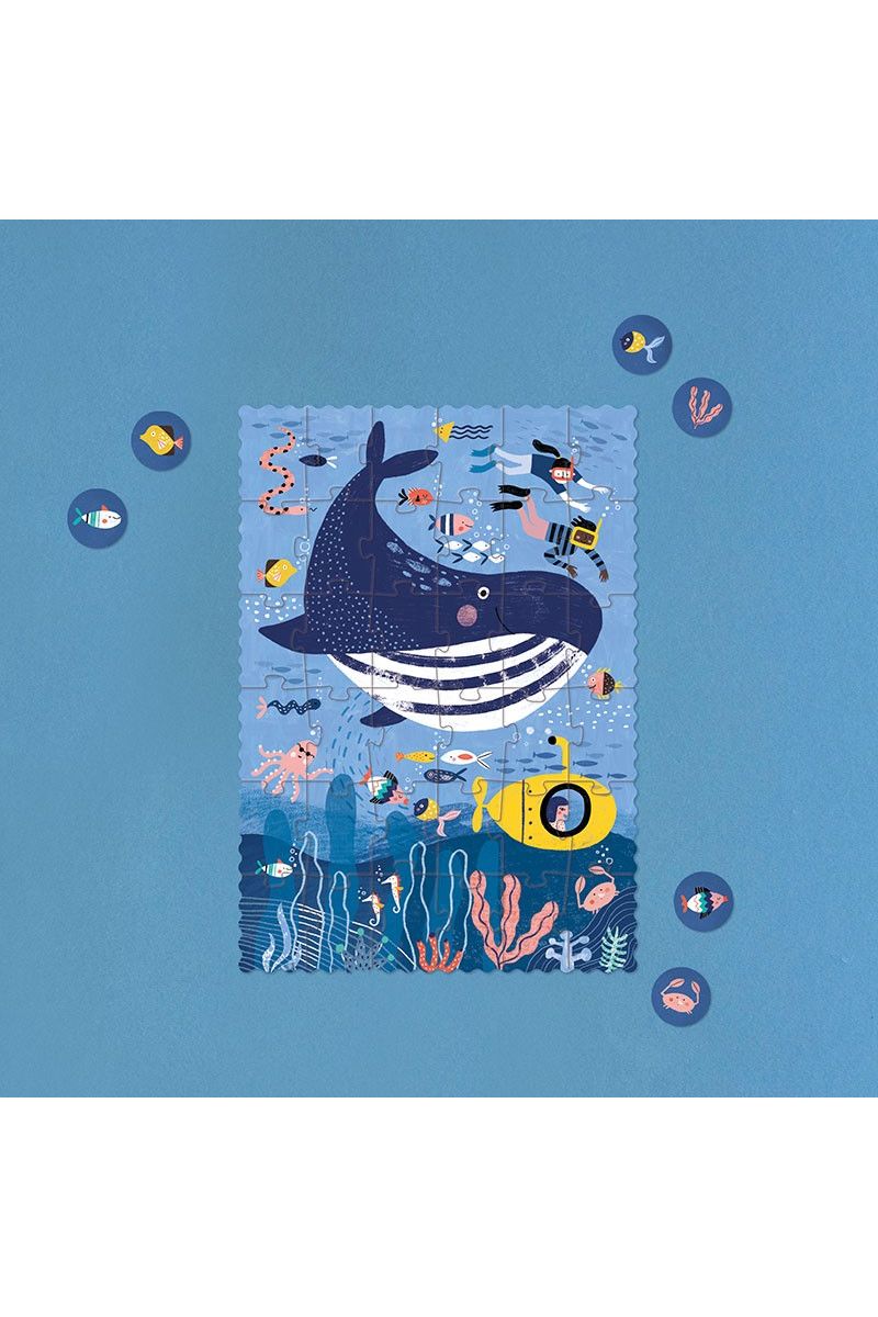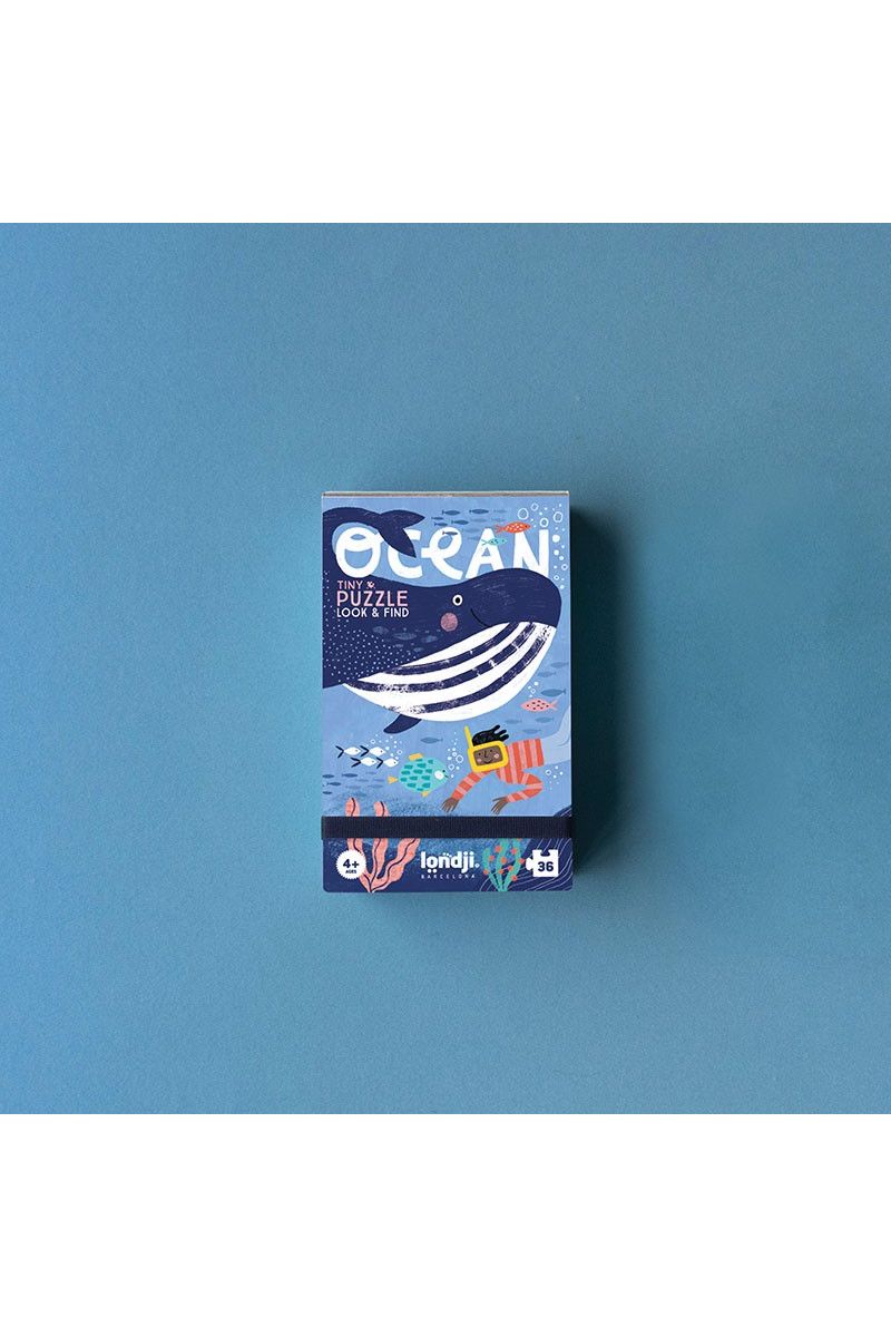 Duik in de oceaan met de Ocean Tiny Puzzle van Londji! Zwem mee met de grote blauwe walvis en andere zeedieren. Deze kleine puzzel van 36 stukjes bevat 12 extra observatiestukjes over de zee. Het is een educatief, duurzaam en lokaal gemaakt speelgoed, ideaal om mee te nemen op reis. Geschikt voor kleine ontdekkingsreizigers vanaf 4 jaar.