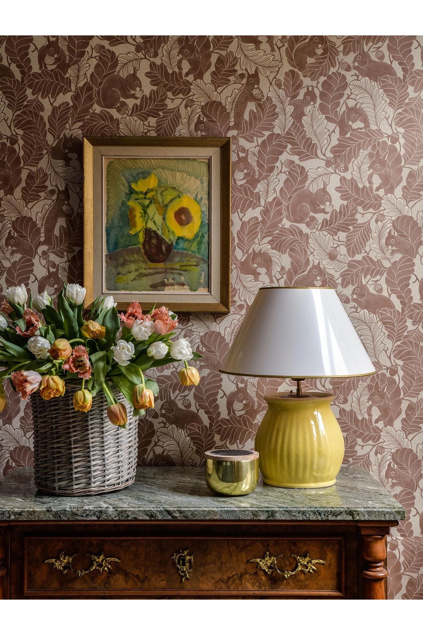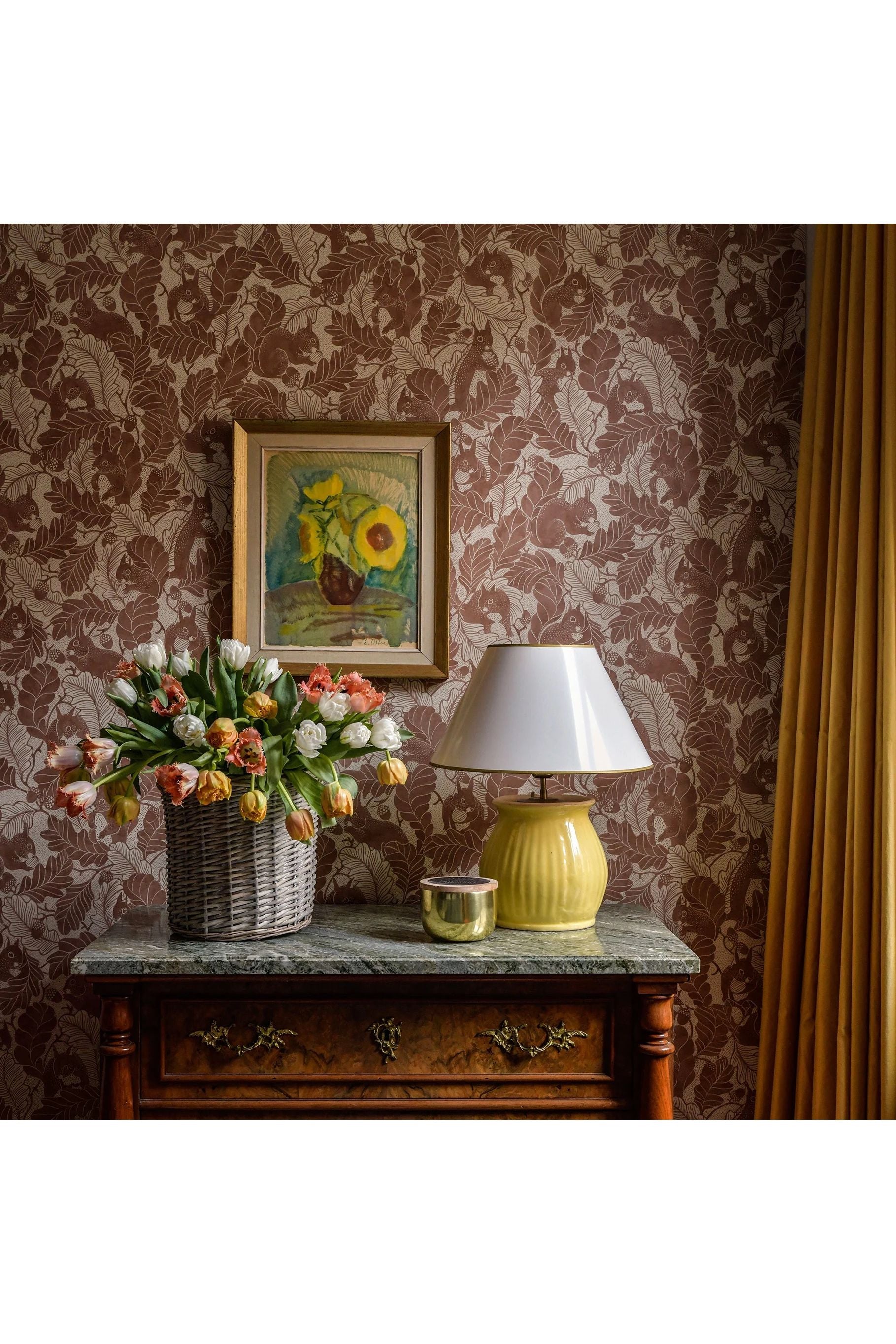 Ontdek het betoverende "Wallpaper Oak Tree Tails - Powder Tan" van Långelid / von Brömssen! Dit speelse behang toont nieuwsgierige eekhoorns die eikels verzamelen in een majestueuze eik. De bladeren en eekhoornstaarten vloeien prachtig in elkaar over, waardoor een handgeschilderd effect ontstaat met levendige diepte. Dit vliesbehang, gemaakt met traditionele druktechnieken, is makkelijk aan te brengen. Voeg een vleugje magie toe aan elke kinderkamer met dit duurzame en charmante behang.